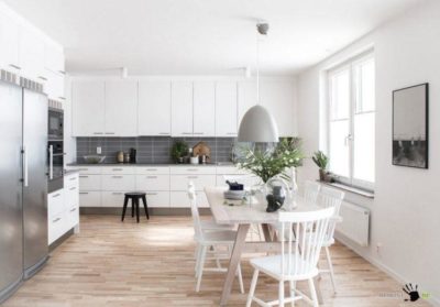 Descubra cómo diseñar bellamente el interior de la cocina-comedor (o incluso el área de comedor en la cocina) mirando la oferta de fotografías de habitaciones con diseños y soluciones interesantes.