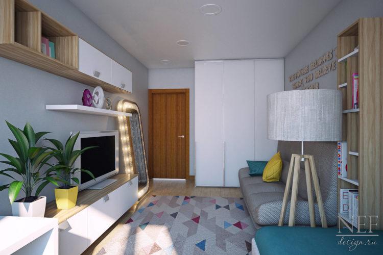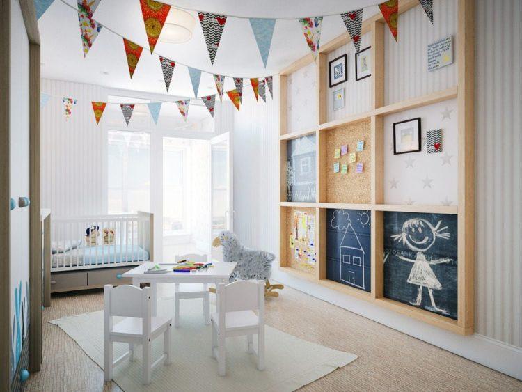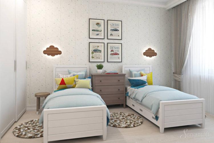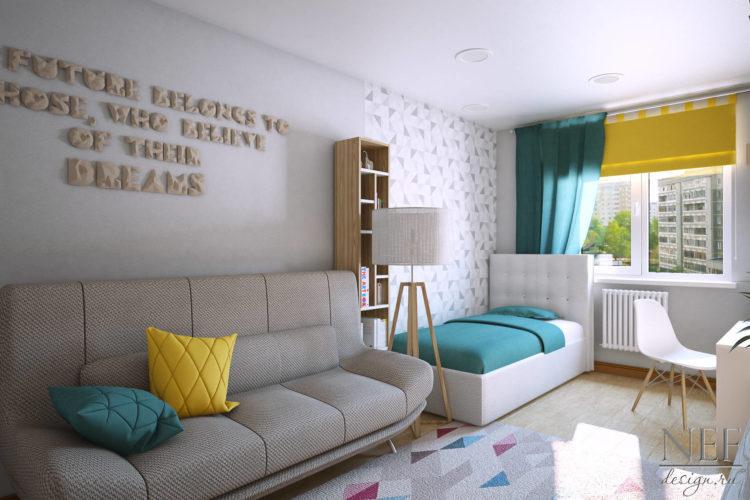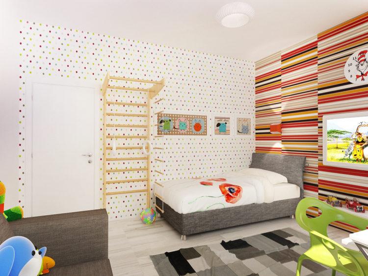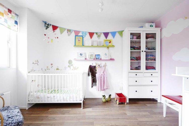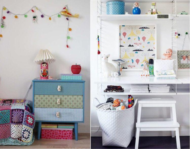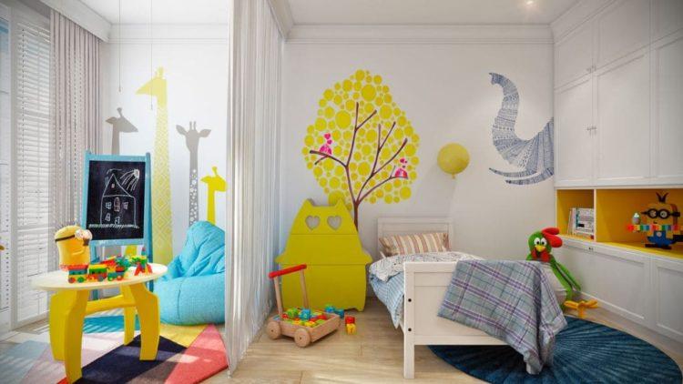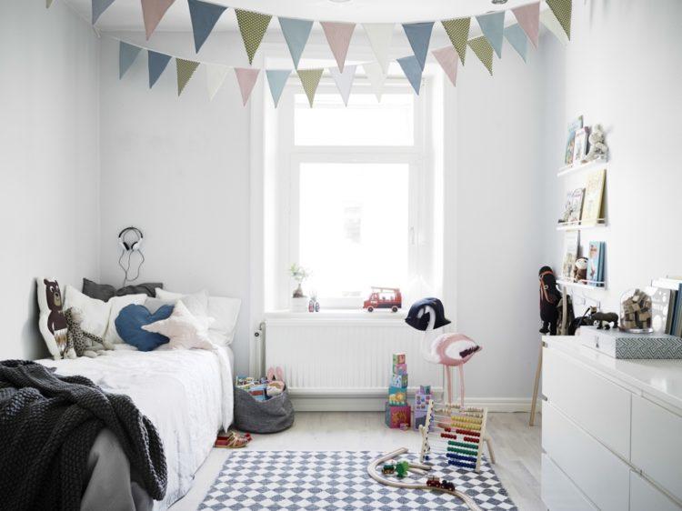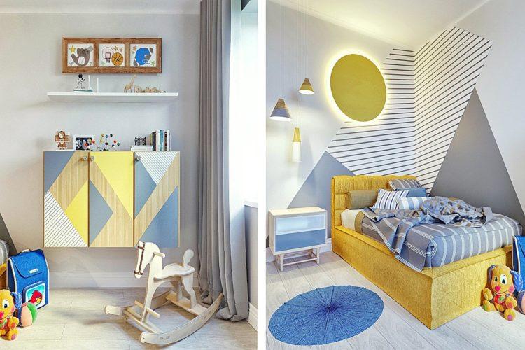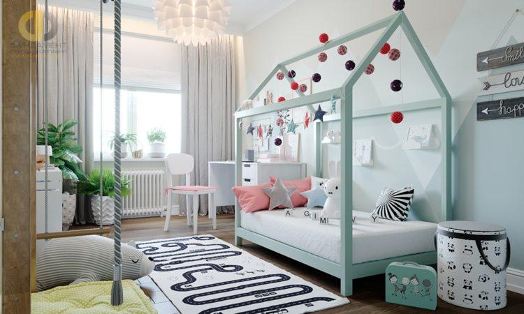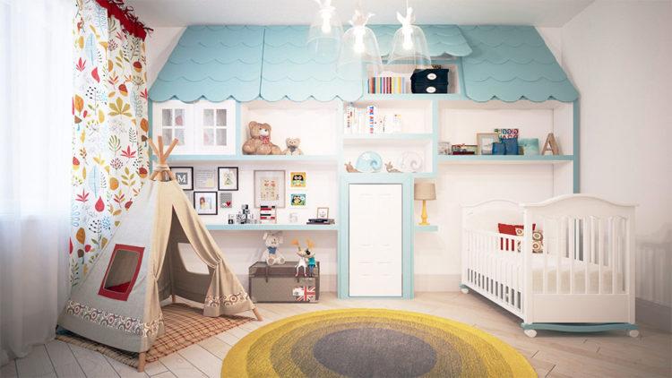 El estilo escandinavo de la habitación infantil en tonos brillantes caracteriza perfectamente este tema.