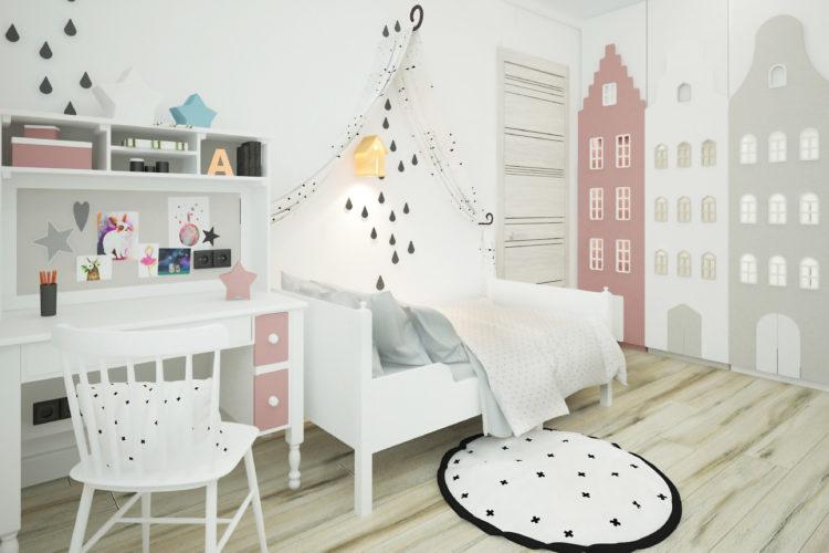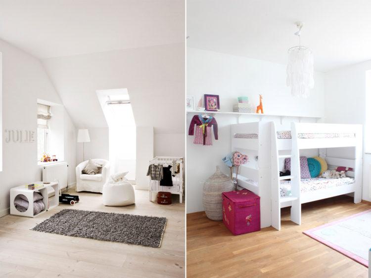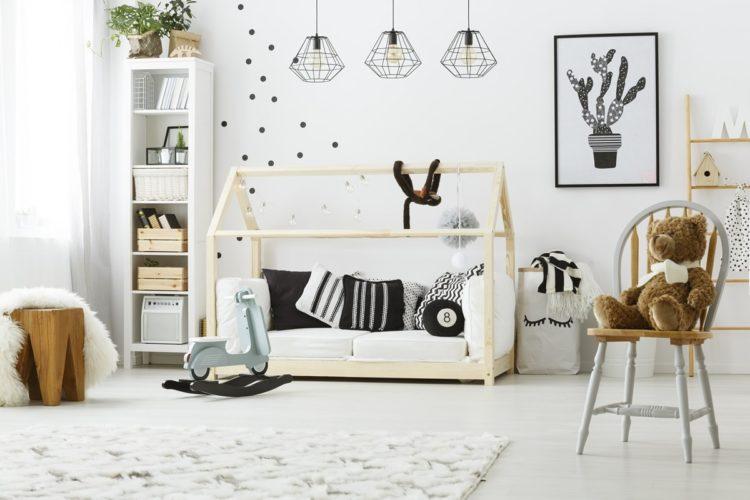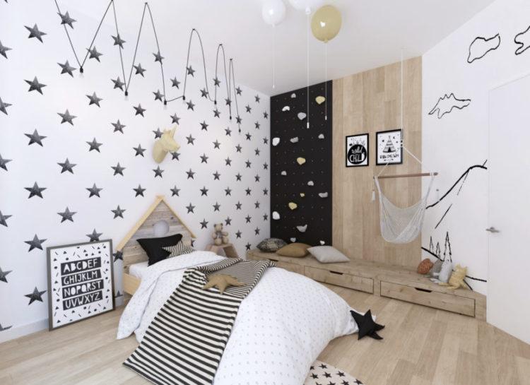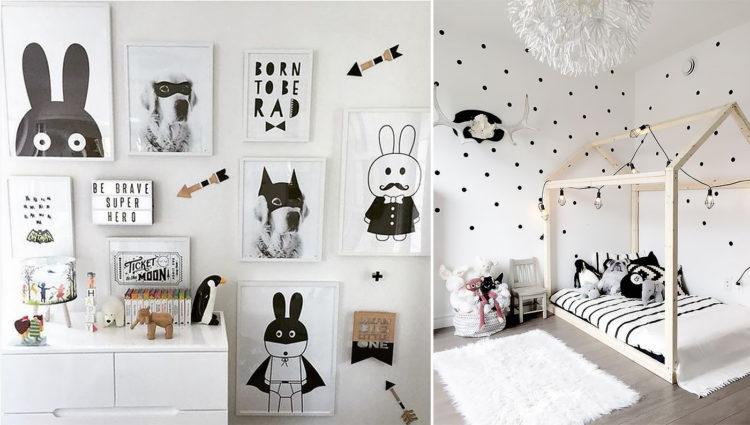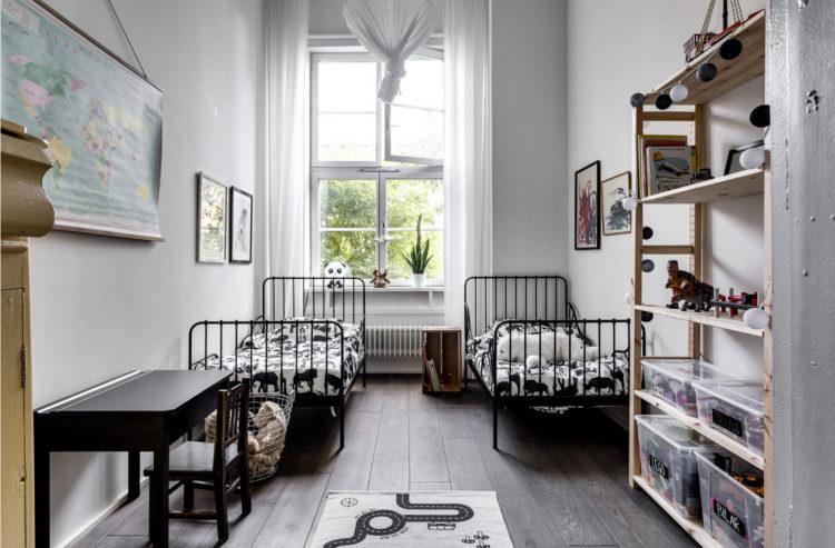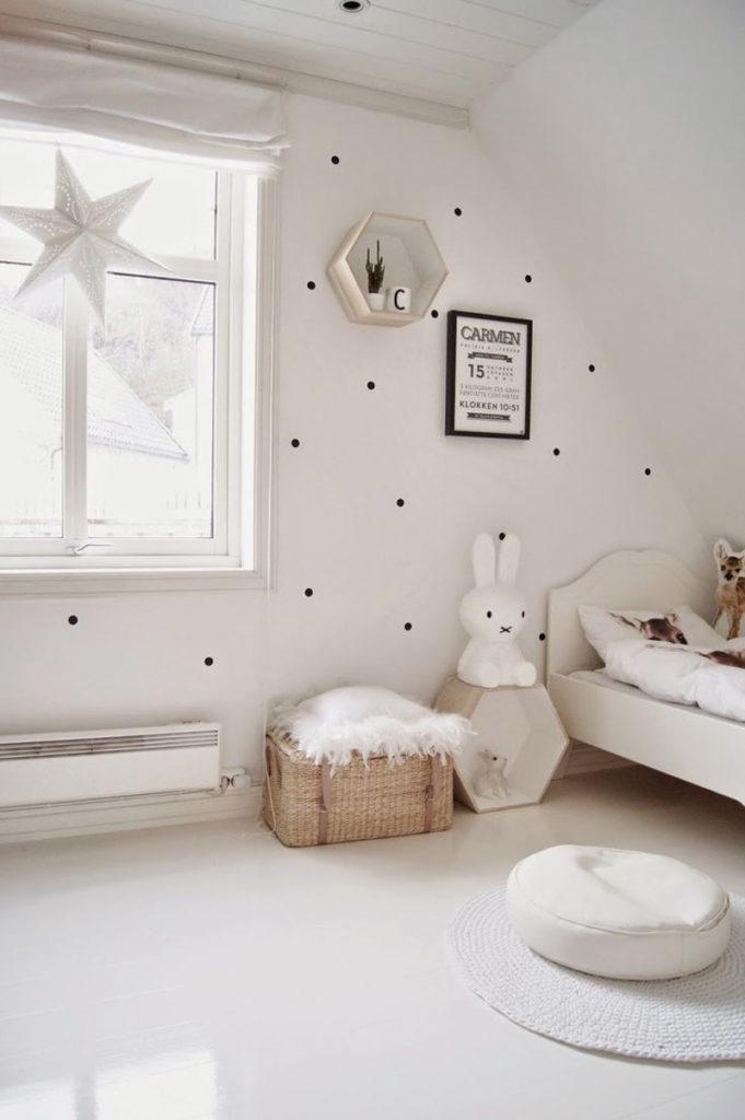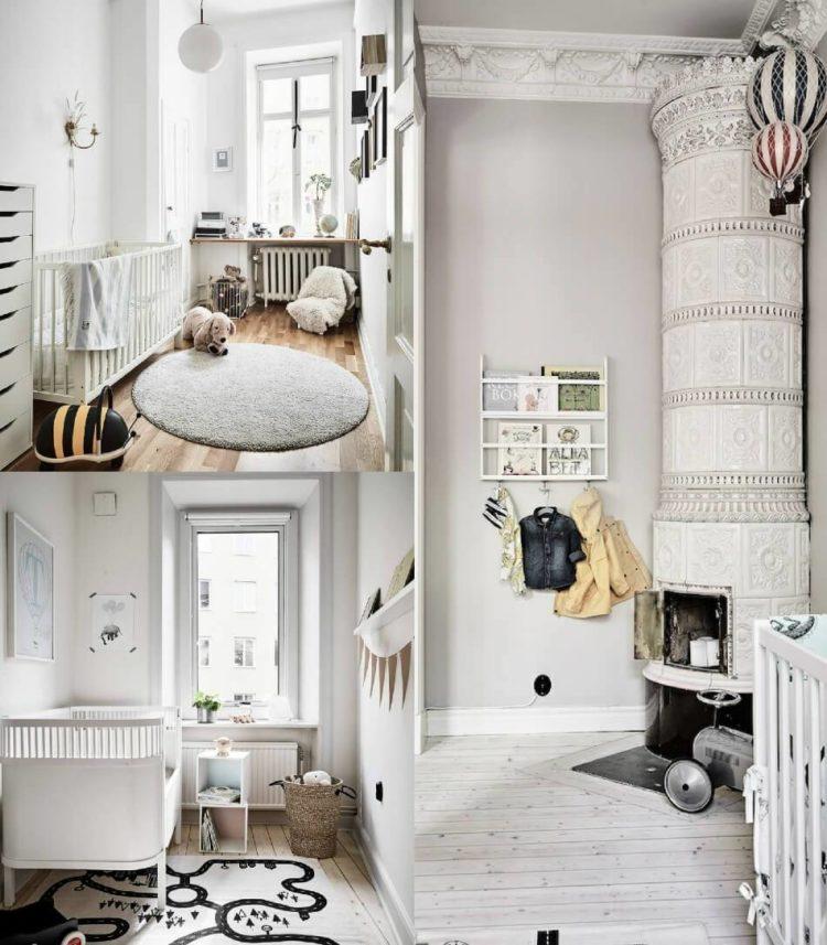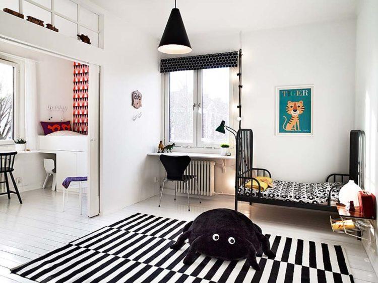 Una guardería para una niña en el estilo escandinavo y una habitación para el niño en el estilo escandinavo pueden tener elementos negros, como almohadas y colchas, o una pequeña alfombra oscura.