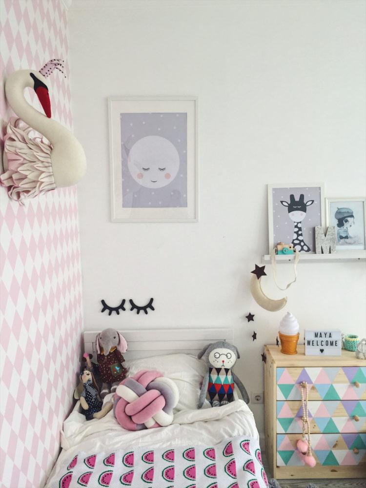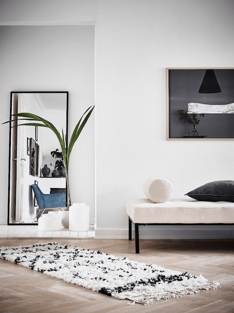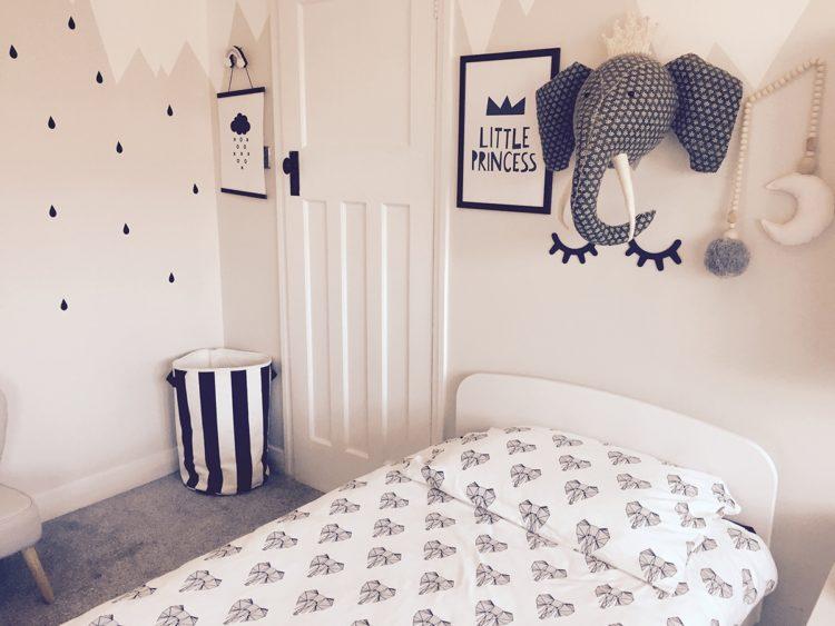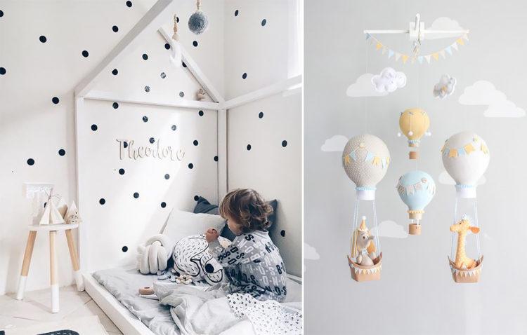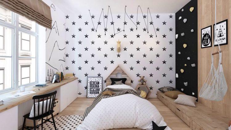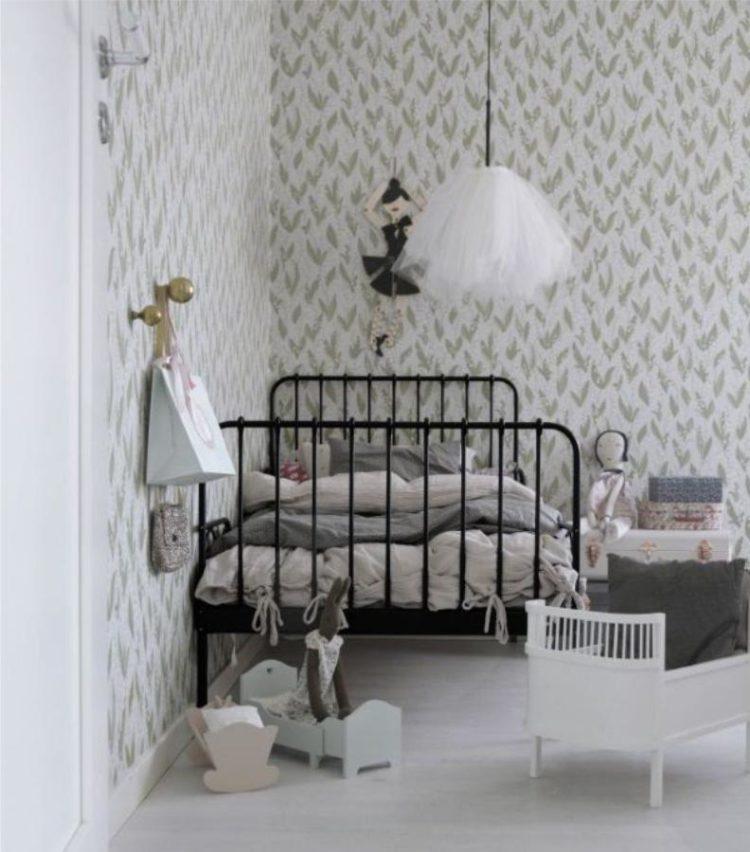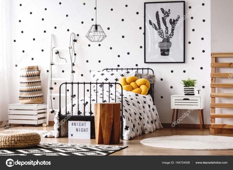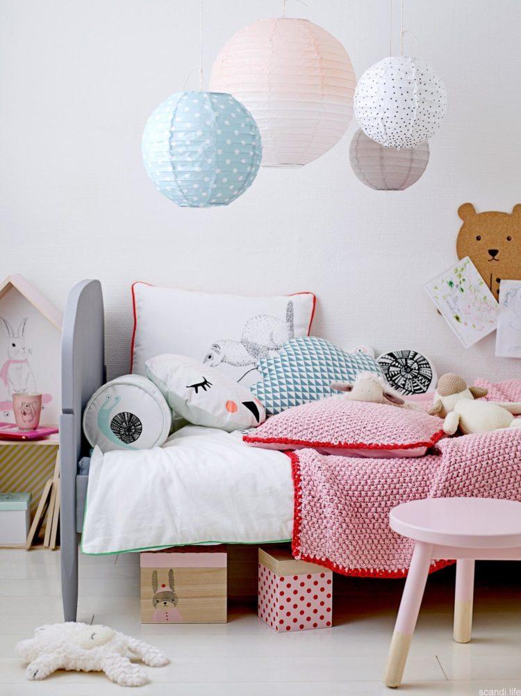 Una guardería para una niña en el estilo escandinavo y una habitación para el niño en el estilo escandinavo pueden tener elementos negros, como almohadas y colchas, o una pequeña alfombra oscura.