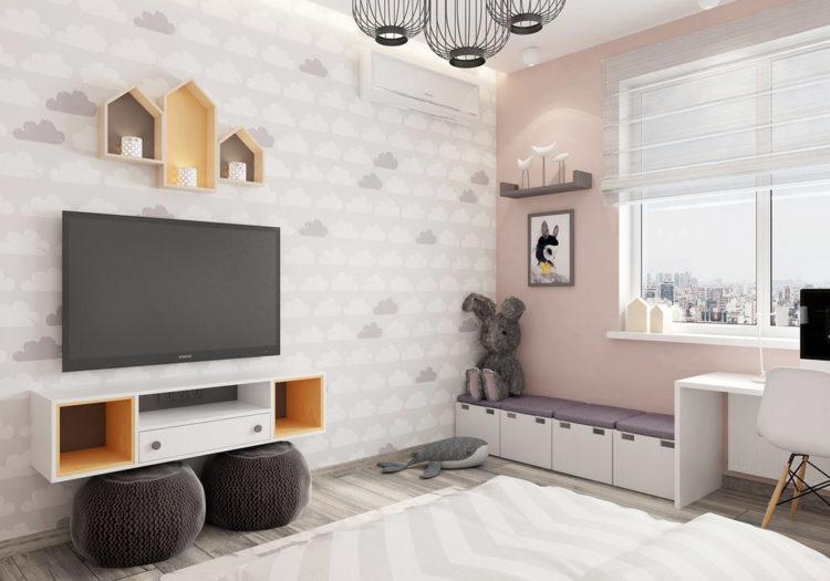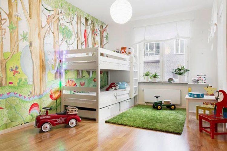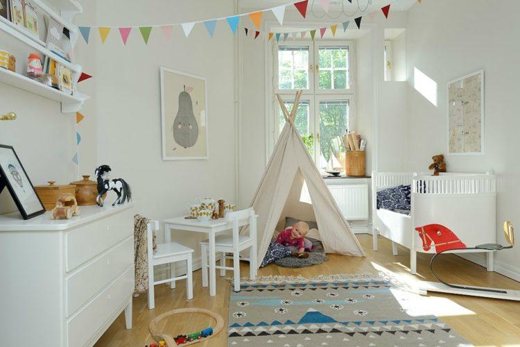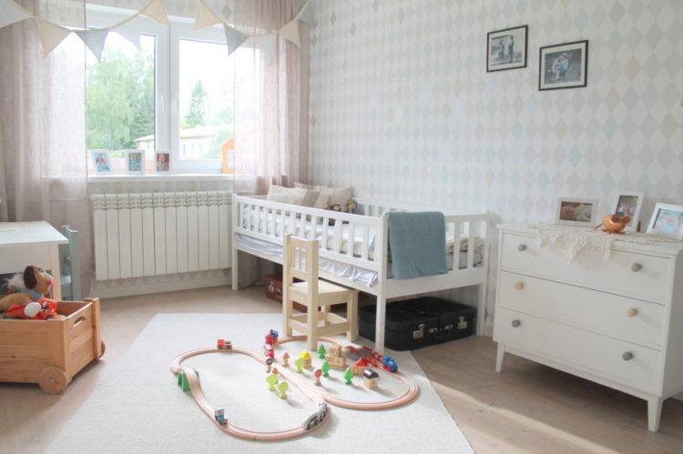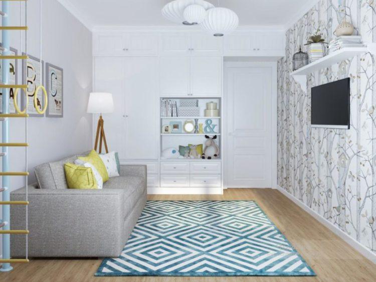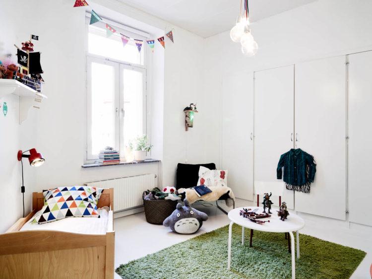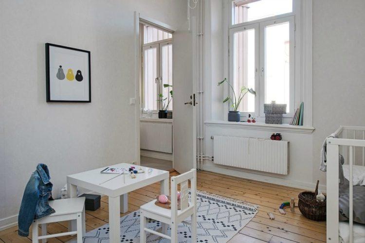 El estilo escandinavo en el interior de la habitación de los niños enfatizará el color blanco como la nieve de los papeles pintados, muebles y alfombras, haciendo que la habitación sea aún más grande.