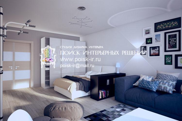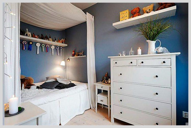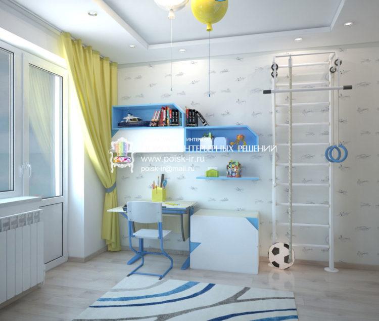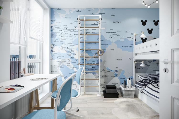 La guardería escandinava con elementos azules se ve muy inusual y brillante. Esta opción es perfecta para un niño.
