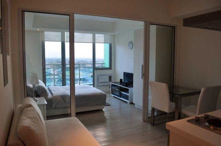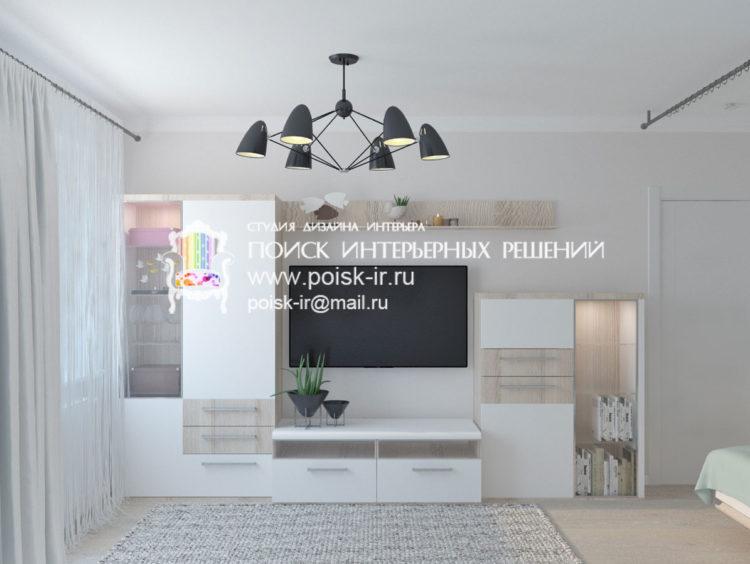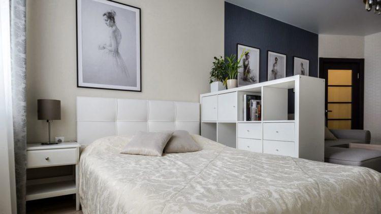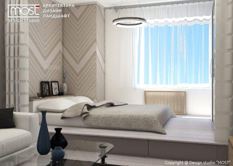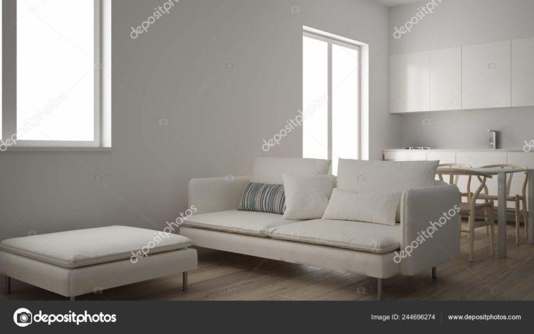 El diseño de la sala de estar en el apartamento, hecho en blanco, le da a la habitación grandeza.
