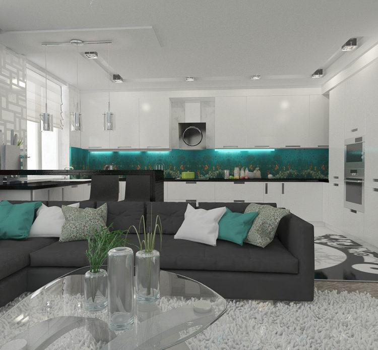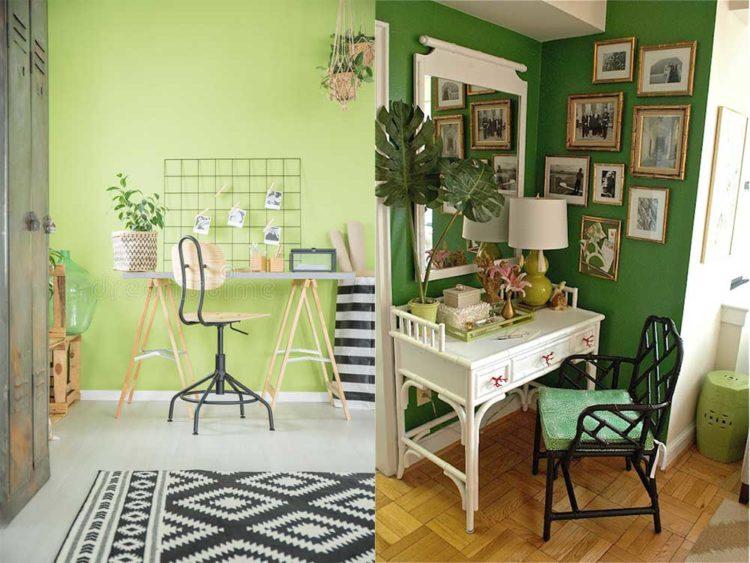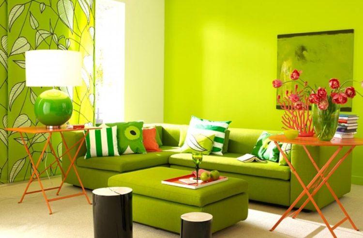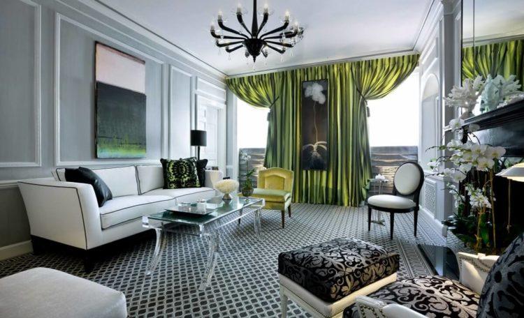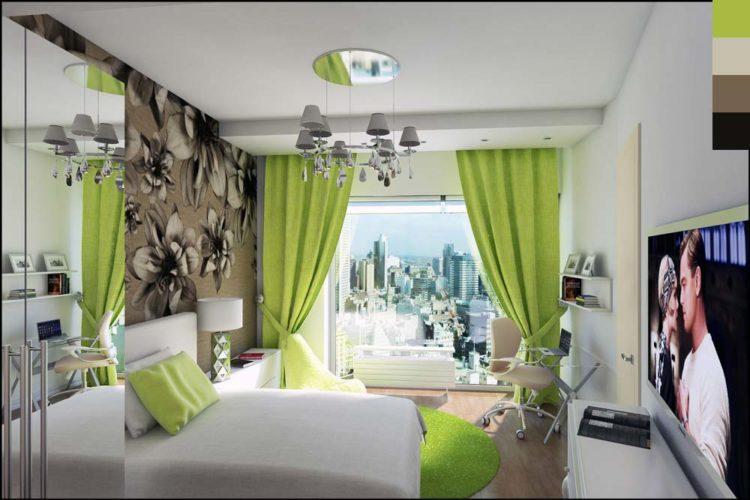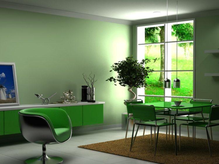 El verde es apropiado como acentos (flores, platos, decoración), fondo (todas las paredes o una pared verde), adecuado para casi todas las habitaciones: cocina, sala de estar, dormitorio y guardería. El color verde de las paredes en el interior de la habitación vigoriza por la mañana y calma por la noche, incluso puede mejorar el estado de ánimo. Sin embargo, un color tan activo puede cansarse rápidamente. La salida es usar verde puro punteado, construyendo el interior en tonos de verde cercanos. Hermosos interiores de los apartamentos se presentan en la foto a continuación.