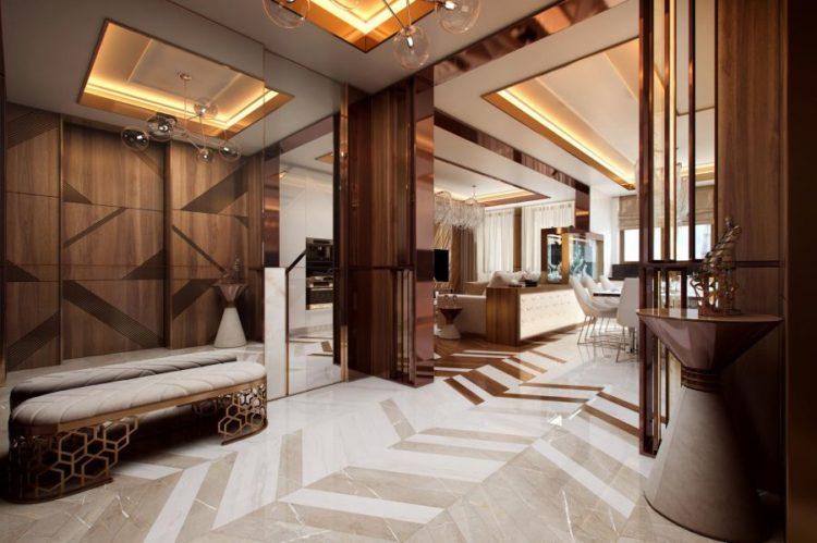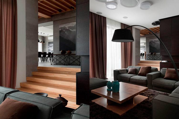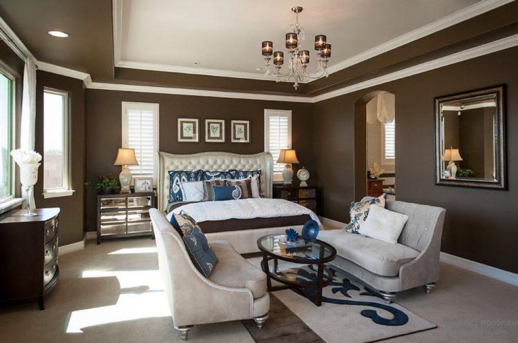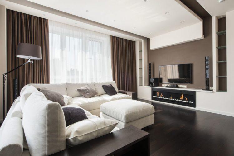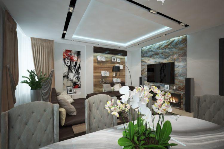 Un cálido y cálido tono marrón le da calidez y ambiente a la habitación. Desnudo, grasiento, ligero, a todos les gusta y al mismo tiempo no se enfoca en sí mismo. Si decide elegir el interior del apartamento y los diseños de las habitaciones en marrón, las fotos del apartamento de diseñadores eminentes le ayudarán a encontrar su opción.