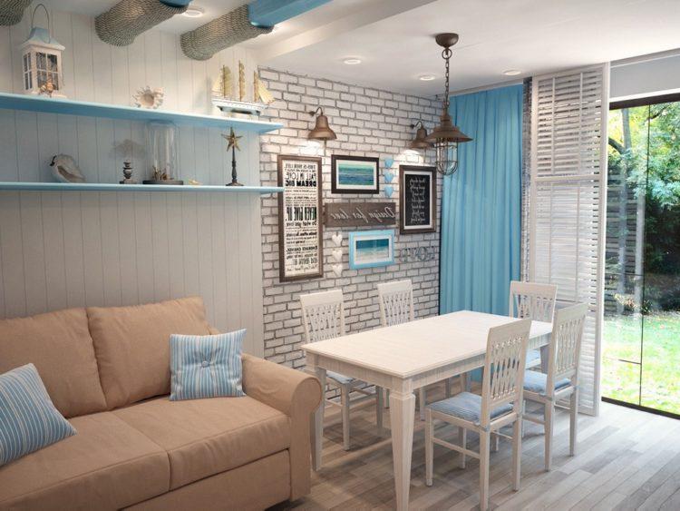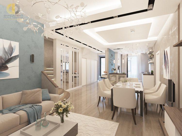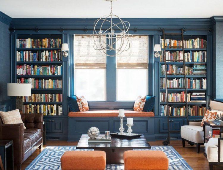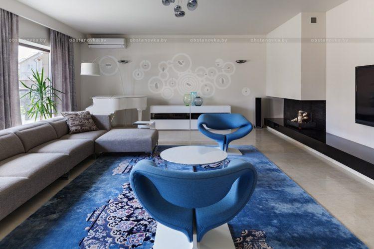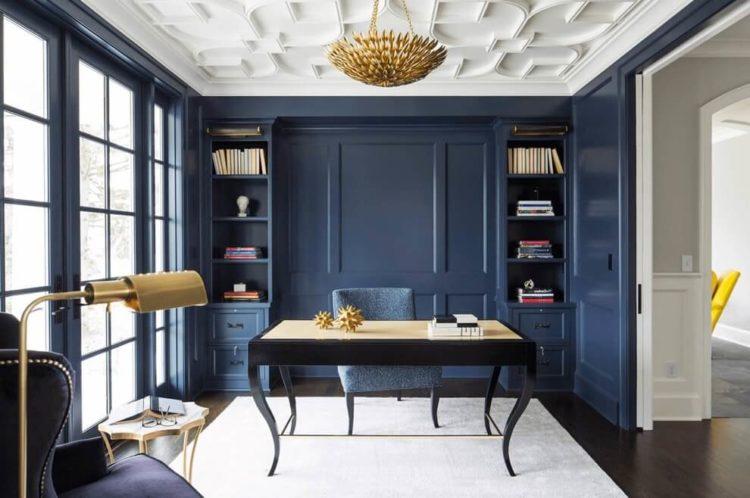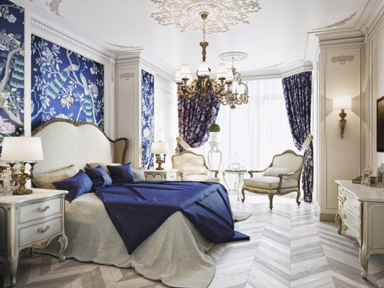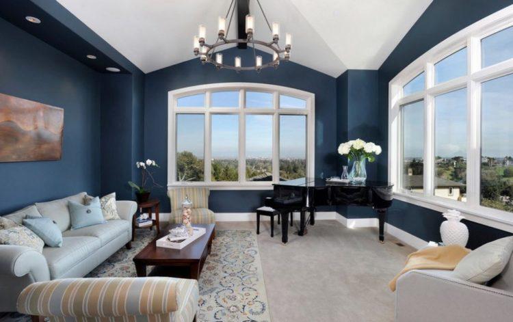 El diseño interior azul es capaz de crear una atmósfera seria y discreta. Si desea colores acogedores, pero los colores cálidos no están cerca, entonces un azul tan apagado es una excelente opción. Una variación más vigorosa de un azul serio es el azul: un ojo suave y no cortante. Este es uno de los pocos colores fríos que combina bien con ocre cálido, tonos amarillos, metal amarillo y rosa, madera. Las fotos interiores presentadas le ayudarán a encontrar su mejor opción.
