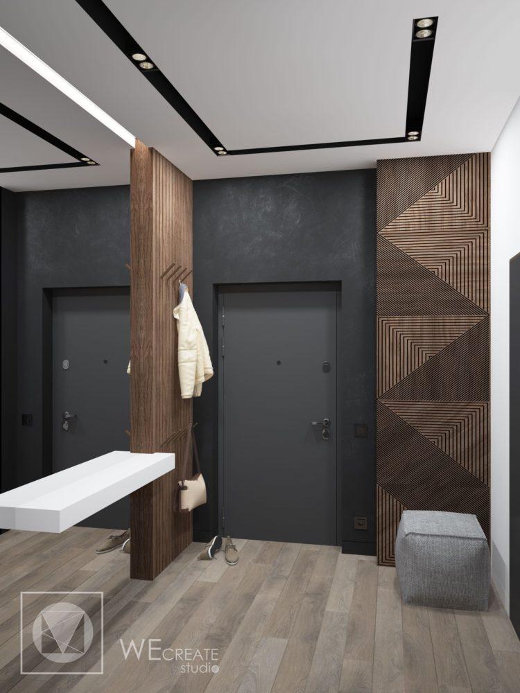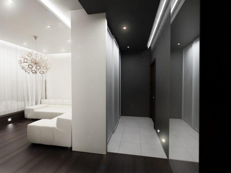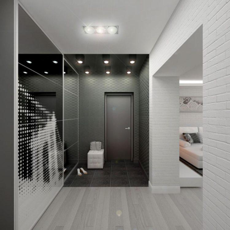 Diseño negro original y elegante del pasillo (foto 2018): las ideas modernas son usar la paleta negra y sus combinaciones con otros tonos y colores. El espectacular interior negro se ve muy bien en combinación con accesorios metálicos, espejos, superficies espejadas, elementos y decoración en otros colores.