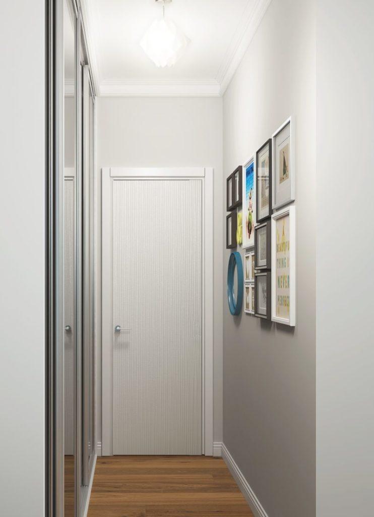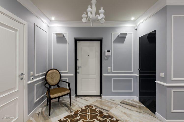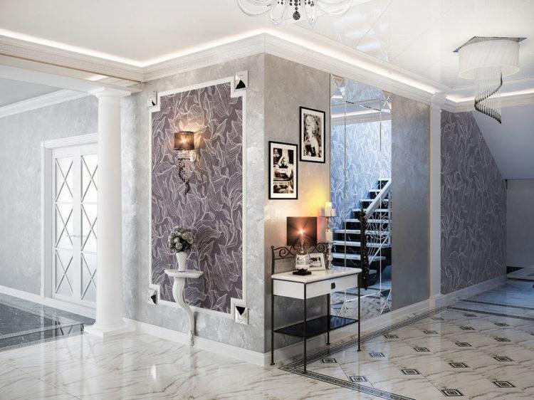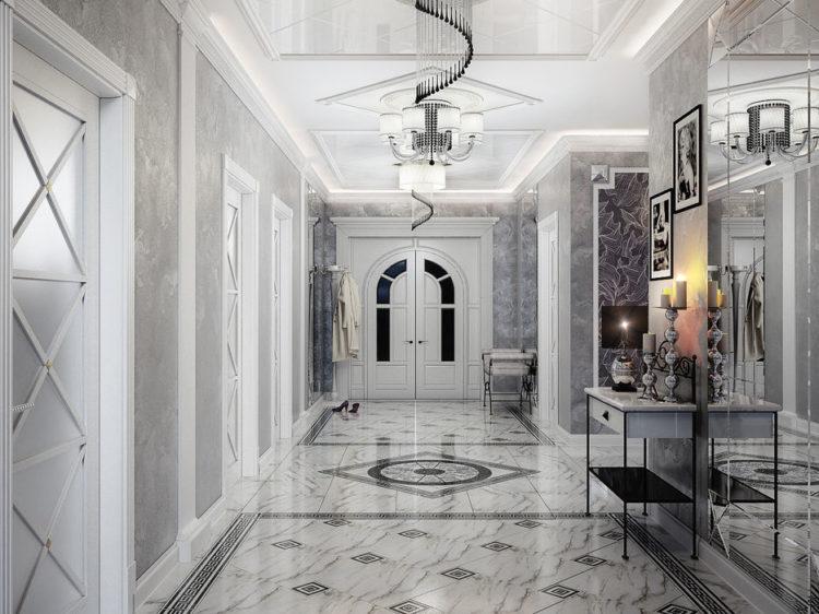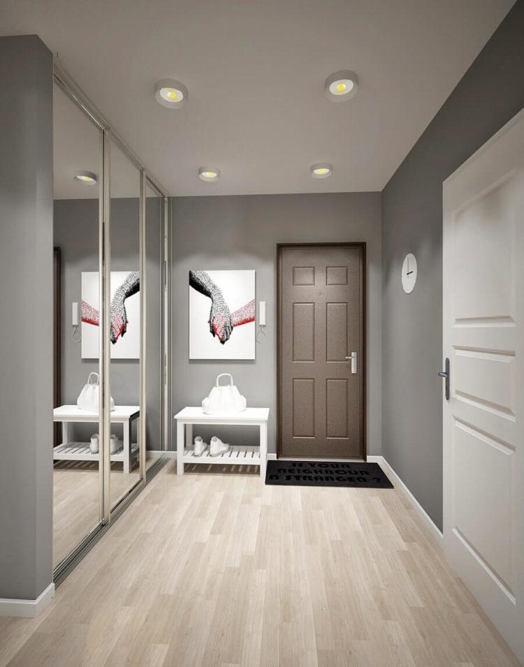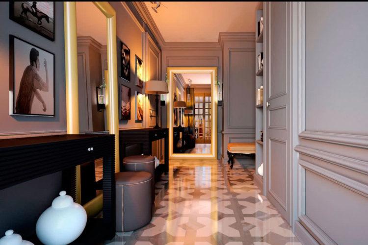 Los tonos grises en el interior del pasillo son discreta elegancia y tranquilidad. Reparando su corredor, el diseño (foto de 2018) se puede construir sobre la base de tonos grises en combinación con otros colores: blanco, negro, beige. Los muebles y accesorios seleccionados adecuadamente, por ejemplo, un espejo con un elegante marco tallado, un banquete blanco, una consola con patas de metal dobladas, ayudarán a enfatizar la originalidad de tal pasillo. Vea cómo el pasillo está diseñado y dispuesto para un pasillo estrecho, cuyo diseño (foto de 2018) está hecho en un fondo gris.