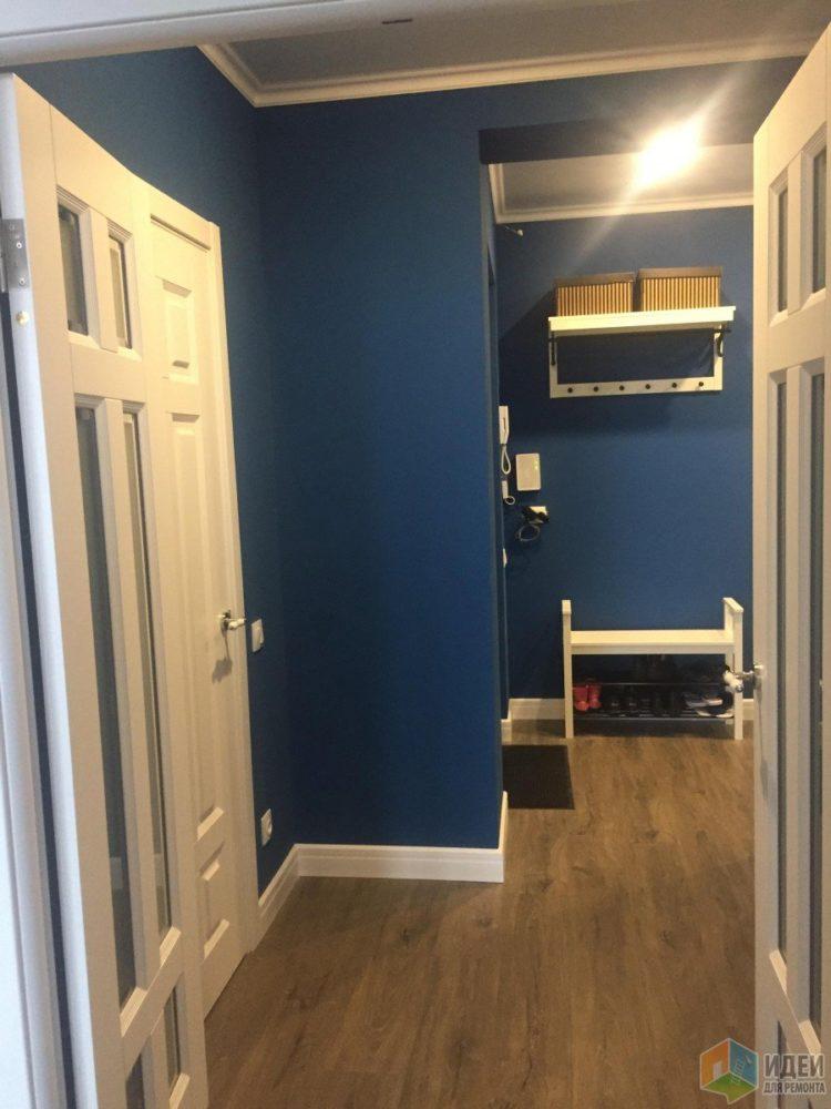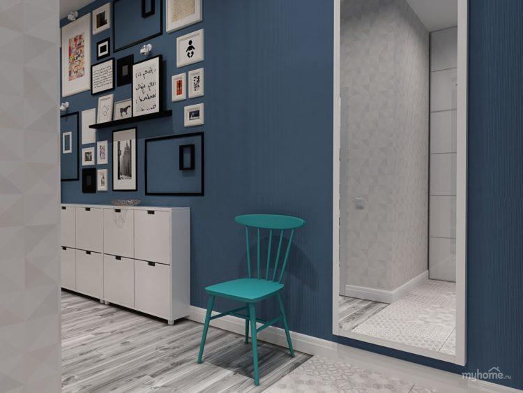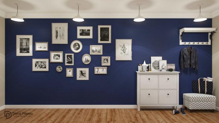 Un fondo azul saturado debe diluirse con un esquema de color más claro. Los tonos azul claro y azul, el color blanco son perfectos. La armonía de dos tonos ayudará a resolver dos problemas: el principal dará frescura a la habitación y el blanco aumentará visualmente el pasillo. Vea cómo el moderno pasillo 2018 está enmarcado en una combinación de azul, cian y blanco. Los estilistas aconsejan usar blanco para la decoración y azul para muebles, cortinas y otros accesorios. Esta es la opción de diseño más común que ayuda a aplicar combinaciones para diferentes estilos: estilos clásico, moderno, estilo marino.