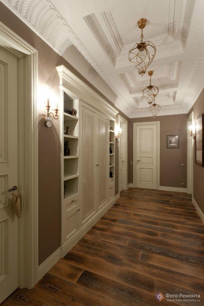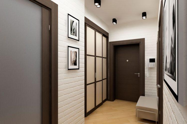 La paleta de color marrón es muy rica, desde beige y caramelo hasta castaño y chocolate oscuro. Hoy en día, el diseño del pasillo 2018 a menudo se crea en base a colores marrones. Estos colores en el interior inspiran fuerza y factor de calidad. Sin embargo, no se recomienda decorar el pasillo y el pasillo solo con tonos marrones. Una combinación de marrón con otros colores es bienvenida. Crear un interior blanco y marrón contrastante le dará a la habitación originalidad y frescura. Vea cómo los decoradores modernos superan el diseño del corredor en el apartamento (foto 2018).
