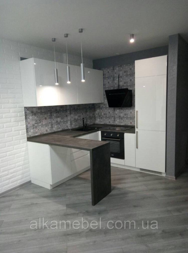 Mire el aspecto de una pequeña cocina con una barra de bar en lugar de una mesa, diseñada en blanco. Parece mucho más de lo que es en realidad. La barra de mesa para una cocina pequeña se puede colocar contra la pared.