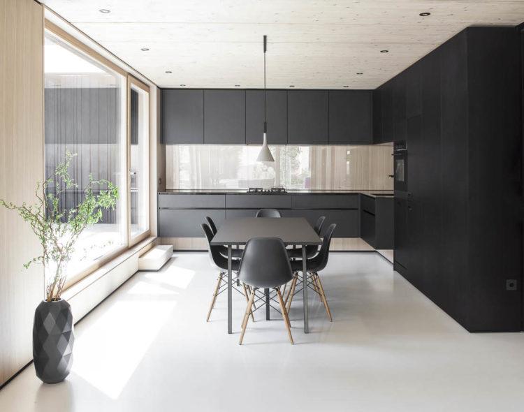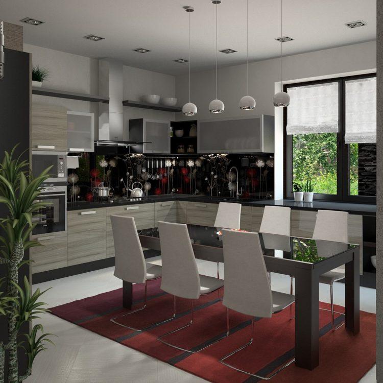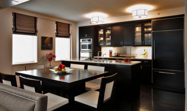 El color negro, como cualquier oscuro, es adecuado para espacios grandes y brillantes, y por lo tanto, es mejor diseñar un comedor en una casa privada (las fotos transmitirán la belleza de dicho diseño), donde se puede asignar un área grande para esta habitación. En negro, puedes decorar muy bien la cocina-comedor al estilo escandinavo, al estilo de alta tecnología, industrial, etc.