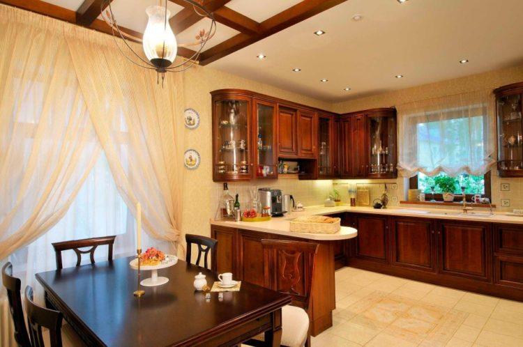 Como regla general, el comedor de la cocina (puede ver la foto a continuación) se puede decorar en colores oscuros, si se le asigna una habitación suficientemente espaciosa (a menudo esto se puede hacer en una casa privada), donde hay espacio para un auricular masivo y un área de comedor completa. Pero definitivamente no se recomienda pintar toda la cocina en colores oscuros, ya que habrá una sensación apremiante, falta de luz y aire: haga una elección a favor de los muebles oscuros o pinte las paredes oscuras.