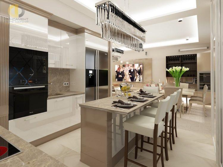 El diseño del comedor en la cocina en colores beige es un clásico que nunca se aburrirá. Y si combinas beige con blanco y marrón en el diseño interior de esta habitación, resultará mágicamente.
