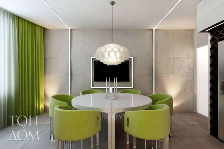 El color verde en el diseño de interiores se considera uno de los más universales, y por lo tanto, el diseño de la cocina del comedor (foto, como siempre, a continuación) en este color es una buena solución. Pero tenga en cuenta que los tonos verdes brillantes no son deseables para el diseño de grandes superficies, y el verde oscuro, por el contrario, se revela precisamente en grandes áreas.