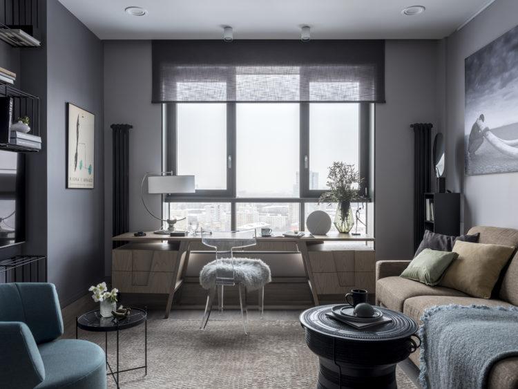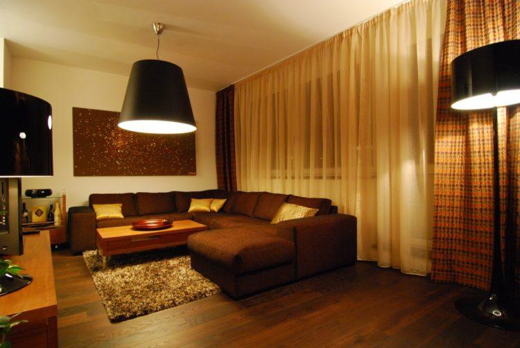 El hermoso diseño del apartamento se puede decorar en colores oscuros, pero solo si la habitación es lo suficientemente espaciosa y una combinación sostenida de colores.