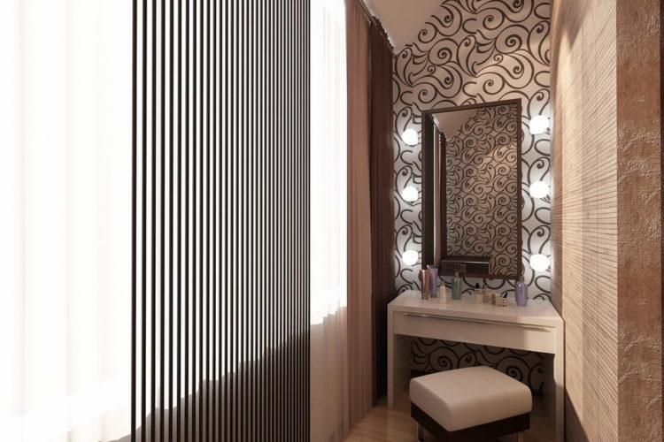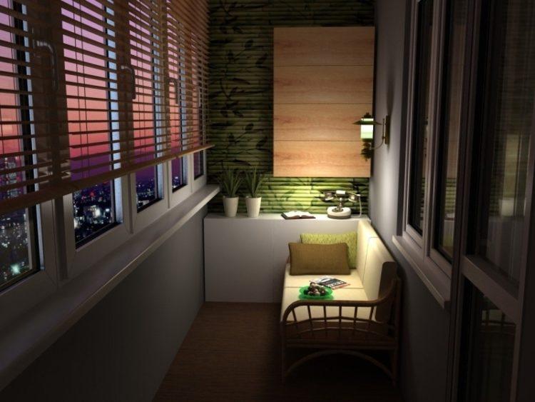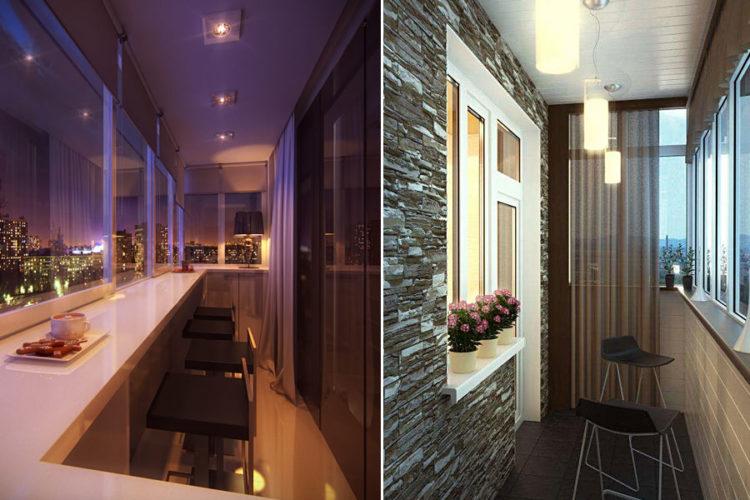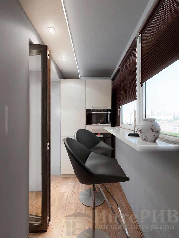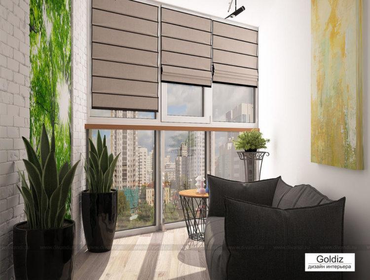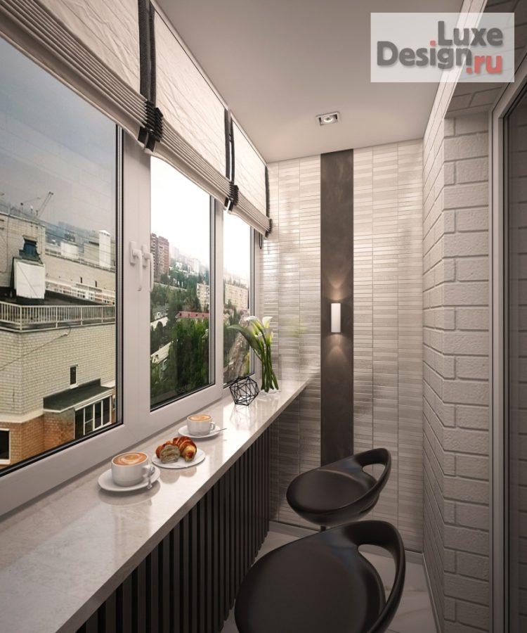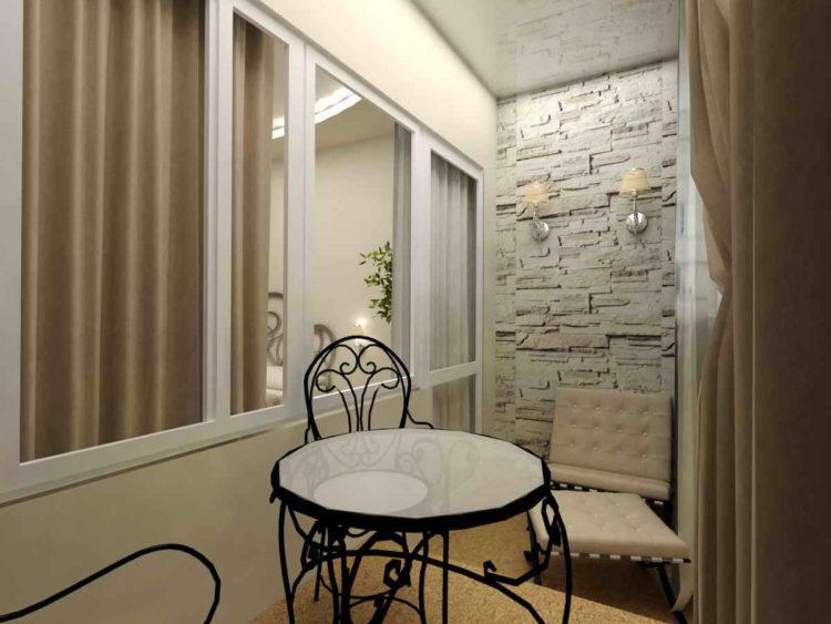 El diseño de un pequeño balcón se puede hacer en colores oscuros, pero luego es mejor colocar un espejo o ventanas panorámicas en el balcón para agrandar visualmente la habitación.