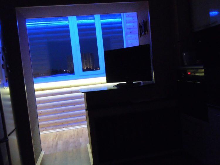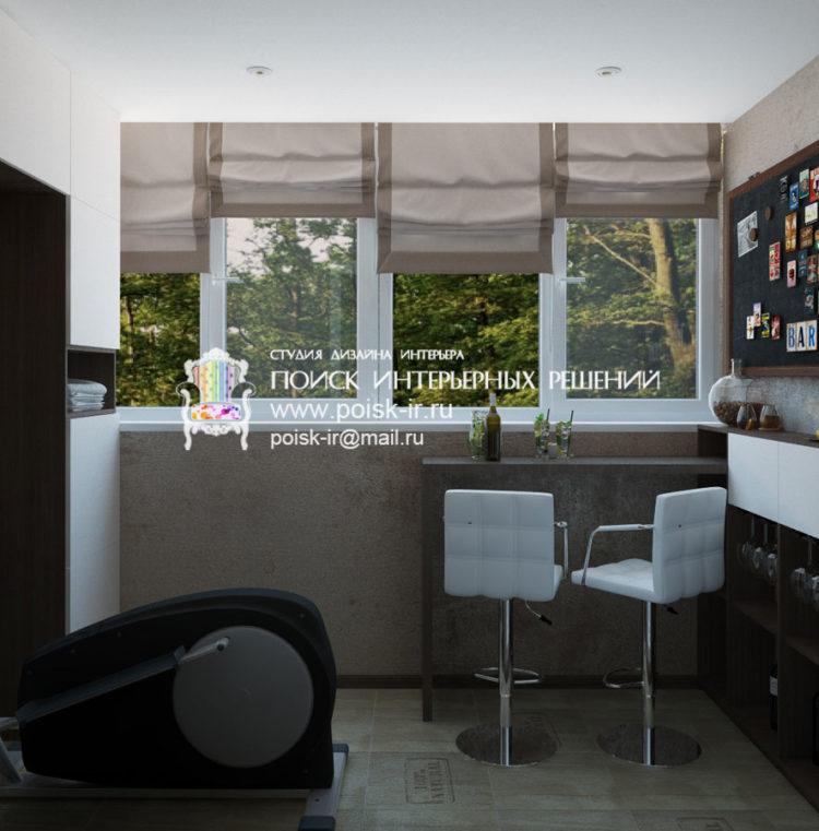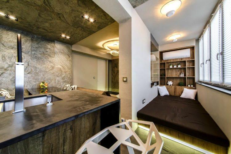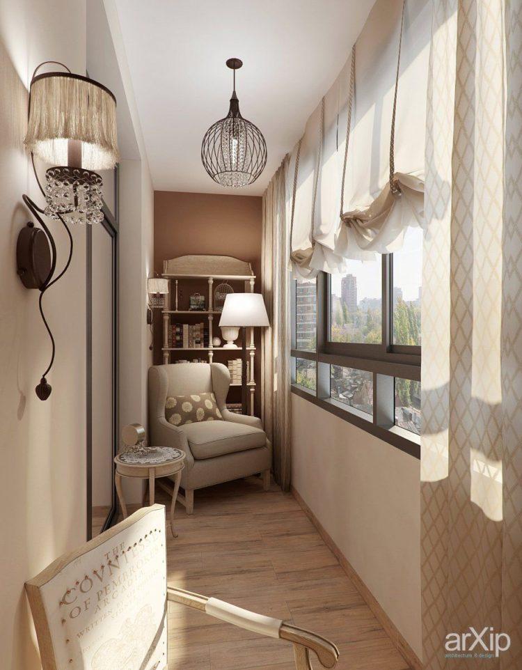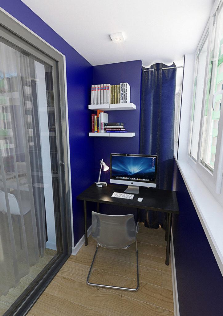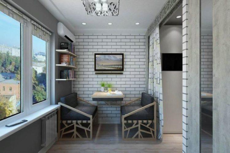 El diseño de un pequeño balcón se puede hacer en colores oscuros, pero luego es mejor colocar un espejo o ventanas panorámicas en el balcón para agrandar visualmente la habitación.