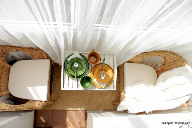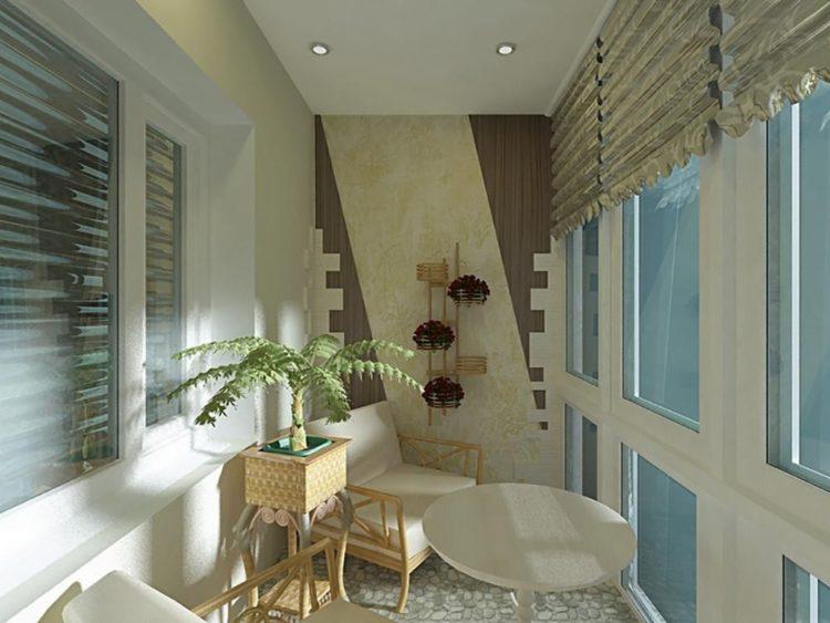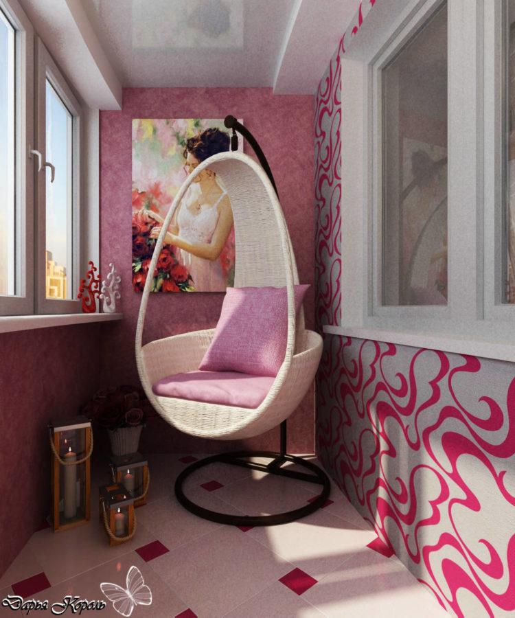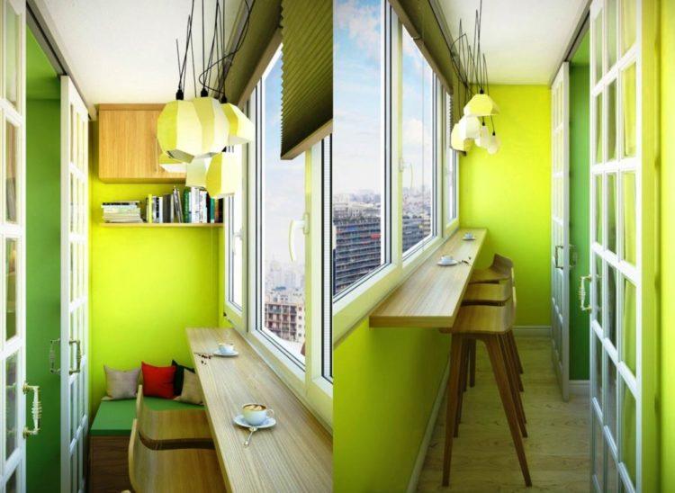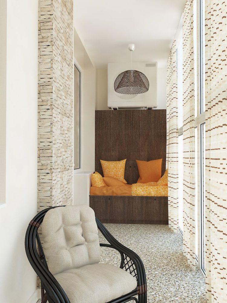 Al realizar un balcón o una logia en colores brillantes, siempre piense en cómo pasará el tiempo en esta parte de la casa. Si no planea relajarse a menudo en el balcón con una taza de café, no haga que esta habitación sea demasiado pretenciosa. Además, no fuerce un balcón o una logia con muchas cosas, para esto es mejor usar un armario. El balcón debe ser espacioso, puede colocar un par de sillones o sillas para relajarse.