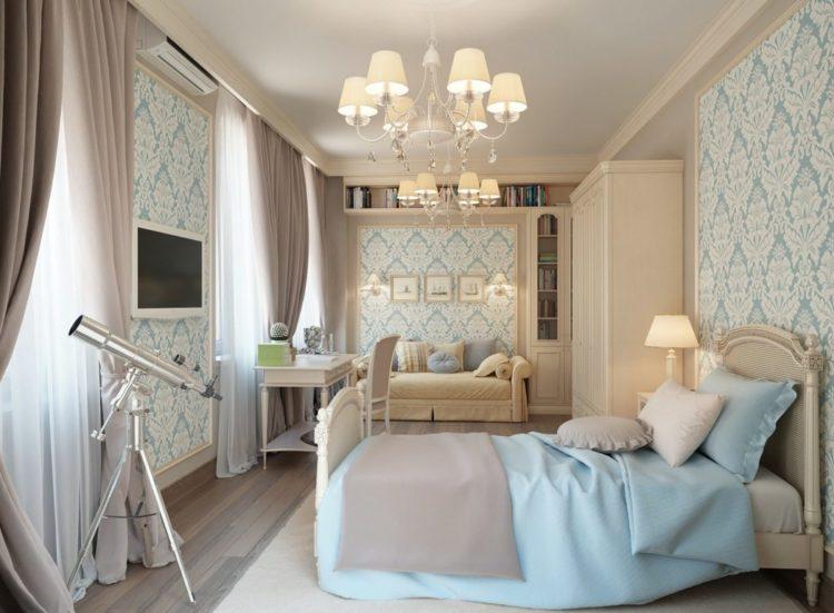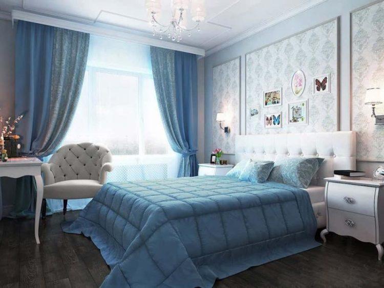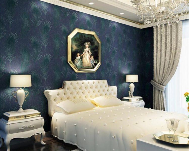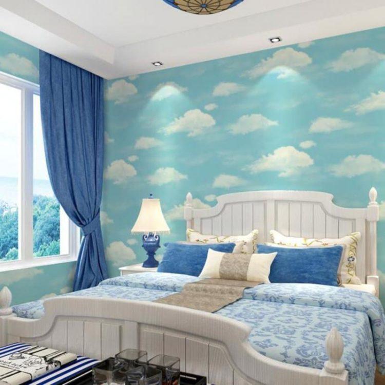 Papel tapiz azul para el dormitorio, el diseño (la foto de los interiores lo ayudará a elegir) que se presenta en la selección, anima el dormitorio pequeño y aporta frescura a la habitación grande. También se usa contraste, por ejemplo, fondos de pantalla blancos y azules para el dormitorio, 2 colores son mucho más fáciles de combinar, aunque hay combinaciones de 3 o 4 colores.