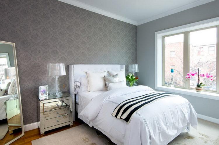 Pegue un hermoso fondo de pantalla en el dormitorio en tonos plateados, esto ayudará a crear un fondo adecuado para unas vacaciones relajantes. El fondo de pantalla gris combinado para el dormitorio, el catálogo (las fotos con diferentes combinaciones se muestran a continuación) del que verá a continuación, será una base excelente para crear un interior exclusivo en cualquier estilo.