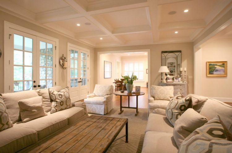Mucho depende de la elección del color. La elegante decoración de la sala con muebles caros se desvanecerá si la combinación de colores no tiene sabor. Para salas de estar de 18 metros cuadrados, se recomienda optar por colores claros: azul, gris, blanco, beige o marrón claro. Tal paleta no solo aumenta el área de la habitación, sino que también se combina fácilmente con otros colores debido a su neutralidad. Puede recuperar acentos: almohadas verdes, tapicería de sofá de cerezo, alfombra lila.