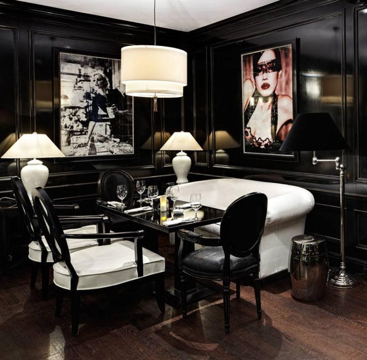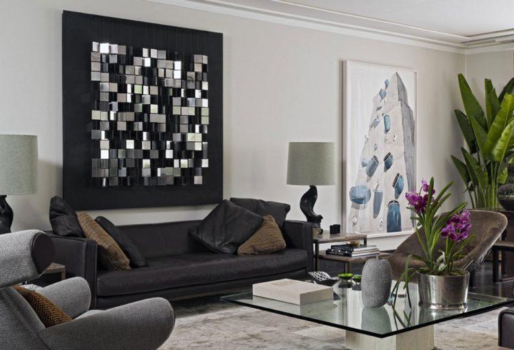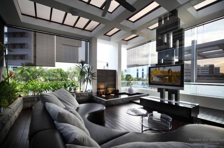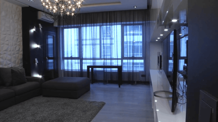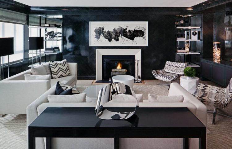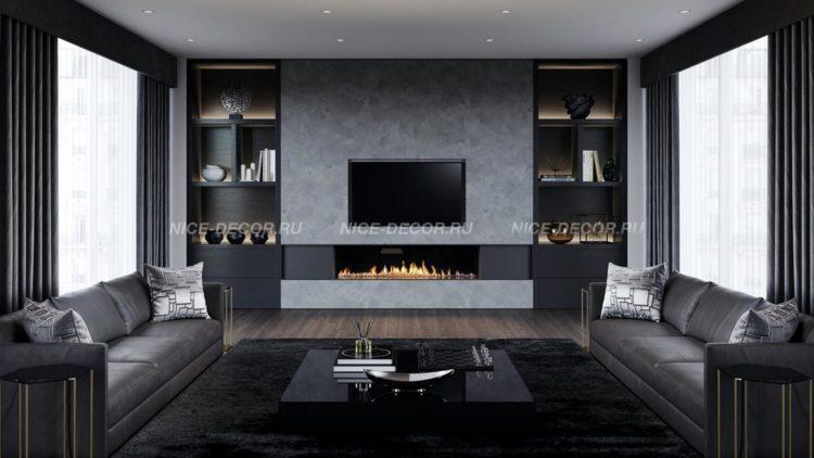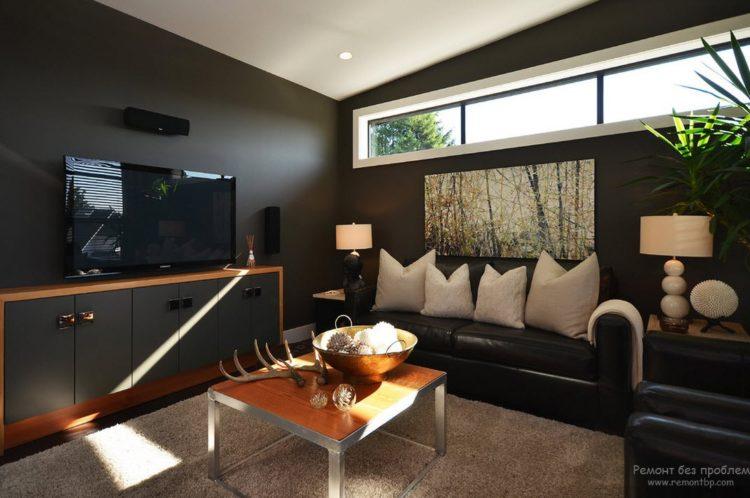 Incluso en un apartamento pequeño, puede dar vida al estilo moderno del interior en tonos negros, que es adecuado para el salón de 18 metros cuadrados. m. en la opción de presupuesto. Con la iluminación adecuada de la habitación, se verá elegante y muy rica. Foto de diseño de sala negra de 18 m2: