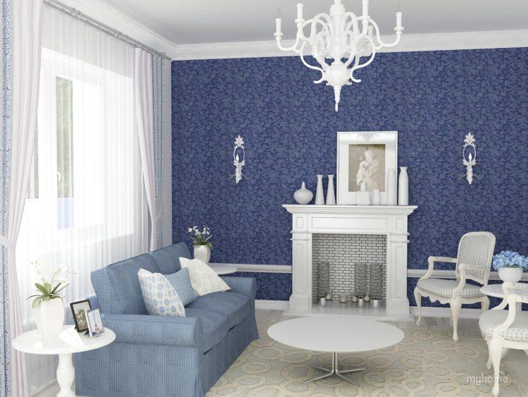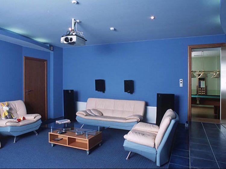 Los colores fríos incluyen azul en el interior. Los tonos de azul son variados: algunos tienden a un color azul delicado, a otros un tono púrpura saturado está más cerca. Depende de qué color azul en el interior se combine mejor con otras pinturas. Por ejemplo, con un tinte azul pálido, los tonos de colores cálidos se combinan armoniosamente. Y los otros colores hacen un maravilloso contraste con él, lo que no se convierte en una disonancia. Interior azul de un estudio tipo estudio de 18 metros cuadrados: