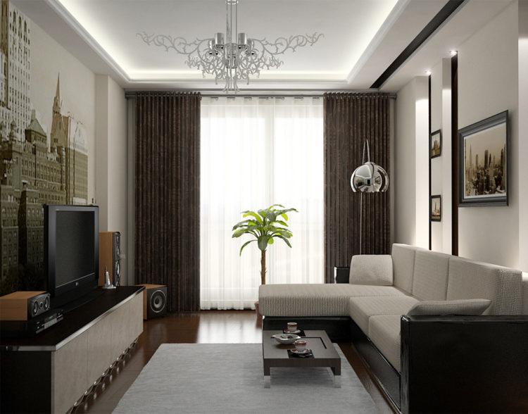 El tamaño de una habitación determina su forma. Si hablamos de 18 metros cuadrados. m entonces mayormente rectangular. Esto debe tenerse en cuenta al organizar. En una habitación larga y estrecha, la zonificación es apropiada. Destacará varias partes funcionales de la sala. Cómo amueblar una sala de 18 metros (ver foto a continuación). Los muebles se instalan cerca de paredes largas. Además, es lo más estrecho posible. Es apropiado usar una alfombra con rayas paralelas a paredes cortas. Esto le permite aumentar visualmente el espacio.