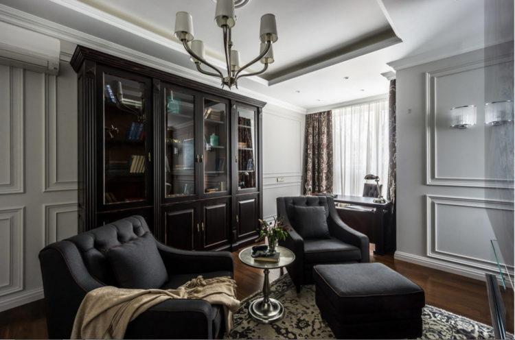 El diseño oscuro de la sala de 18 metros cuadrados cambiará radicalmente su apariencia si elige materiales de acabado claros y brillantes para el techo, las paredes y el piso. Puede iluminar la habitación con la ayuda de un contraste espectacular, que se puede lograr combinando materiales de acabado adecuados. Oscuro estudio interior 18 metros cuadrados ideas para fotos: