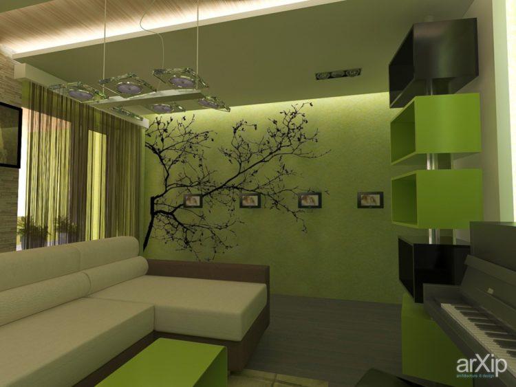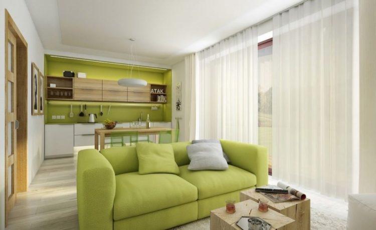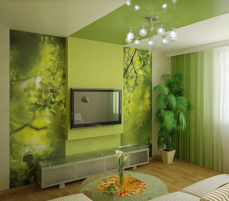 El color verde en el interior se considera una gran opción. Al asociarse con la naturaleza, donde la gente vivía originalmente, él está cerca de la persona psicológicamente. Los tonos verdes suavizan, sintonizan de manera positiva. Foto de diseño de 18 plazas de la sala verde: