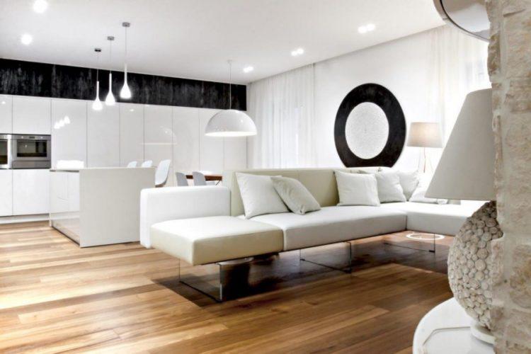 El diseño moderno de una casa de campo con un color blanco básico debe hacerse con precaución. Es importante comprender que este color se ensucia con bastante facilidad y, con su exceso, el diseño interior de la casa puede verse pálido.