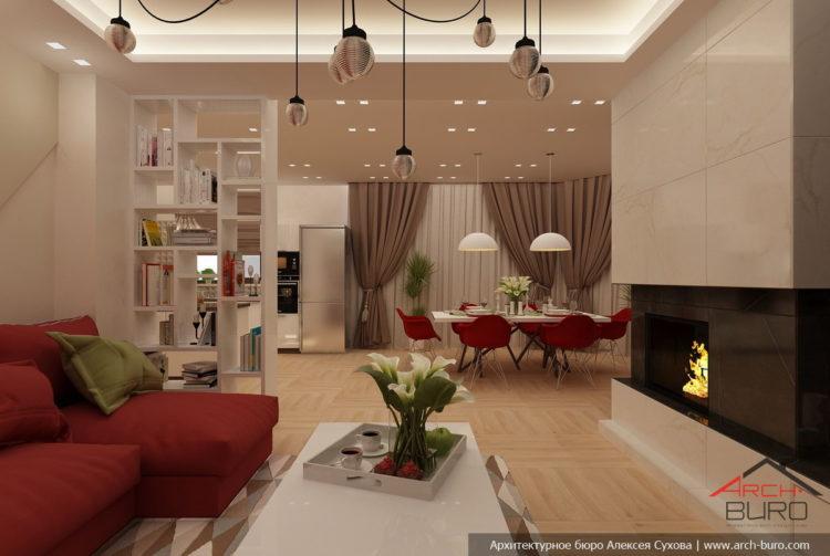 La cocina (sala de estar) con chimenea en rojo atraerá a los activos y enérgicos.