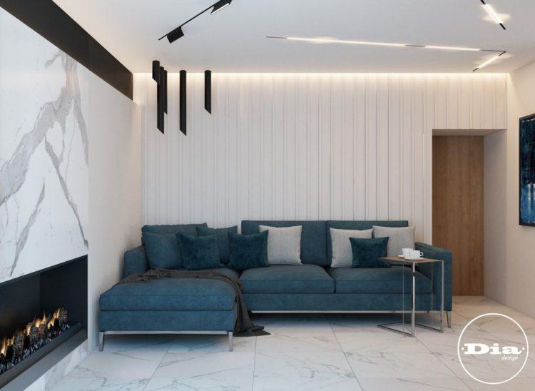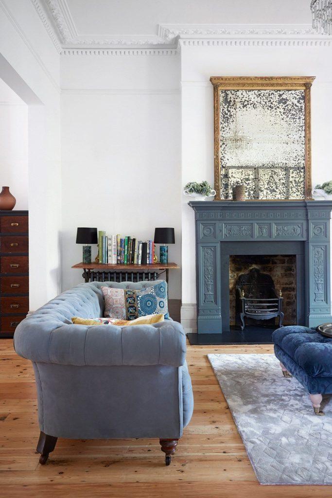 En estas fotos, una sala de estar con chimenea, cuyo diseño se presenta en azul. El uso del azul le da profundidad y significado a la habitación en su conjunto.