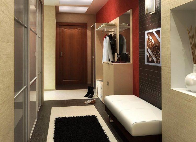 Diseño de corredor rojo (las fotos en el apartamento a continuación son reales) para los muy valientes. Puede diseñar todas las paredes en rojo o resaltar algunos detalles, por ejemplo, un zapatero o un soporte para sombrillas.