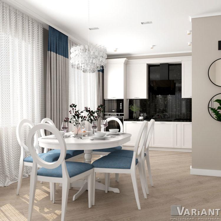 Sala de estar de la cocina tranquila: diseño, las fotos en colores brillantes se ven familiares y clásicas.