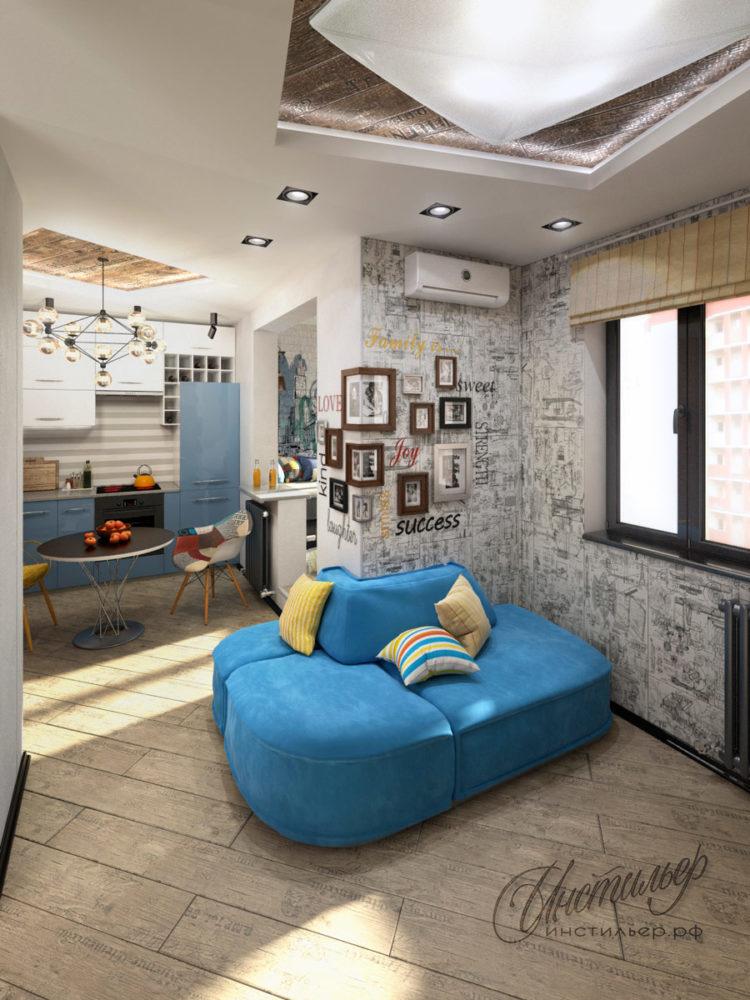 El diseño interior de dicho estudio requiere una cuidadosa selección del diseño de los muebles y la elección de la paleta de colores. Cuando se ubican varias zonas funcionales en una habitación, es muy importante hacerlas simultáneamente espacios independientes y partes armoniosas de una composición.