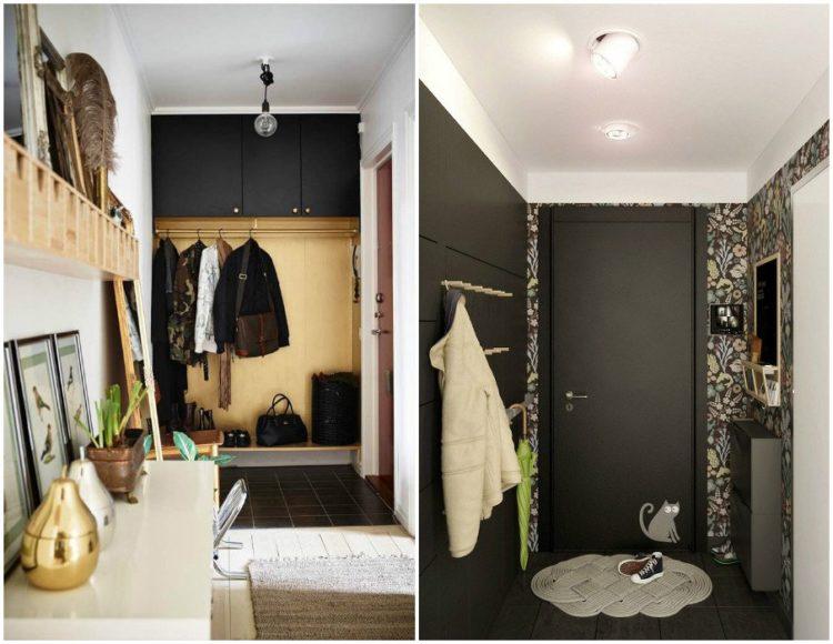 El interior del pequeño pasillo en negro se ve elegante y agrega misterio. Considere el diseño de un pequeño pasillo en el apartamento, las fotos son reales.
