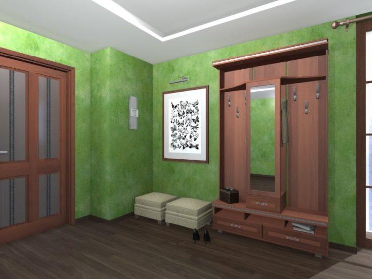 Un pequeño pasillo en un pequeño corredor en verde es una excelente opción si desea aportar más frescura al interior, pero no elija colores demasiado brillantes y saturados.