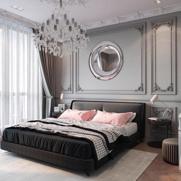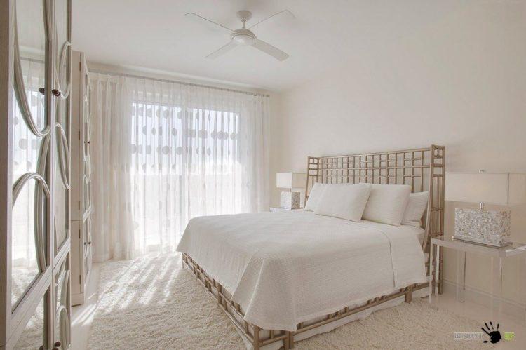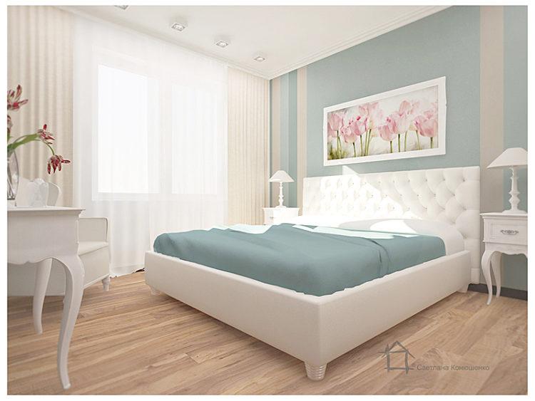 Este diseño es atractivo para calmar a las personas con pensamiento conservador. El diseño de las habitaciones es discreto, no sobrecargado de detalles. El esquema de color blanco combina bien con los tonos pastel de las paredes y los muebles, una pequeña cantidad de dorado se ve armonioso (foto de la habitación a continuación). Este estilo es consistente con muebles ligeros hechos de madera natural, acabado de bronce claro, tapicería textil en tonos suaves apagados, el uso de telas más brillantes para cortinas de ventanas.