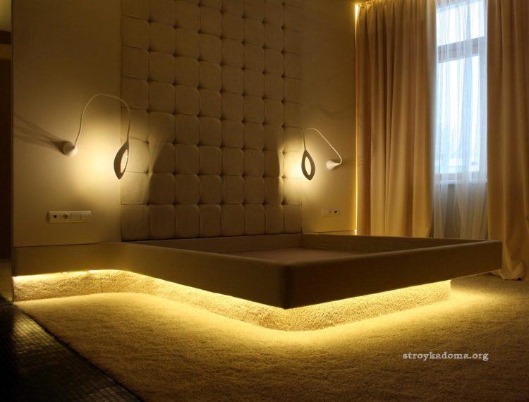 El dormitorio se caracteriza por la sofisticación, líneas y formas suaves. No hay esquinas ni líneas afiladas, se usa ampliamente una combinación de materiales modernos y naturales: vidrio y madera, plástico y piedra natural. No hay restricciones en el esquema de color, puede ser claro u oscuro, es importante que todo se haga en un estilo.