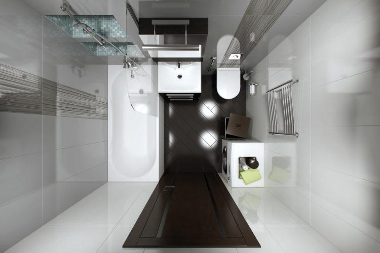 Al elegir un revestimiento de pared oscuro, no olvide hacer acentos brillantes con elementos de plomería cromados. Usando los trucos correctos, puede obtener un baño bastante elegante, el diseño (pequeña foto de moda) que está subordinado al estilo de alta tecnología.