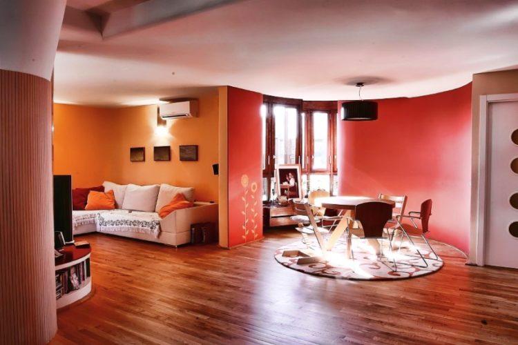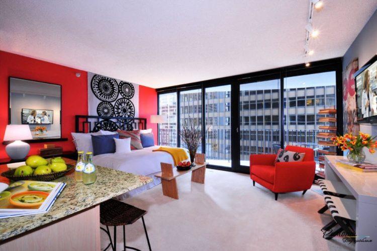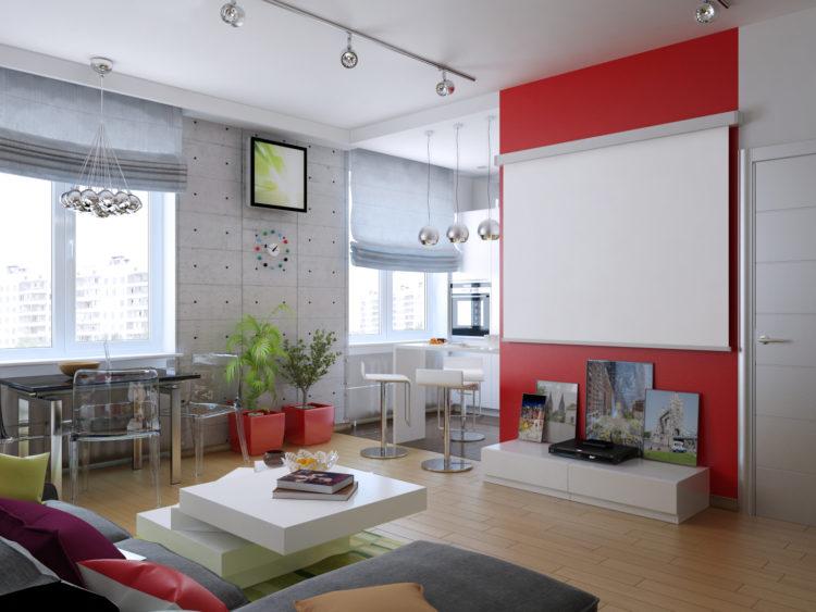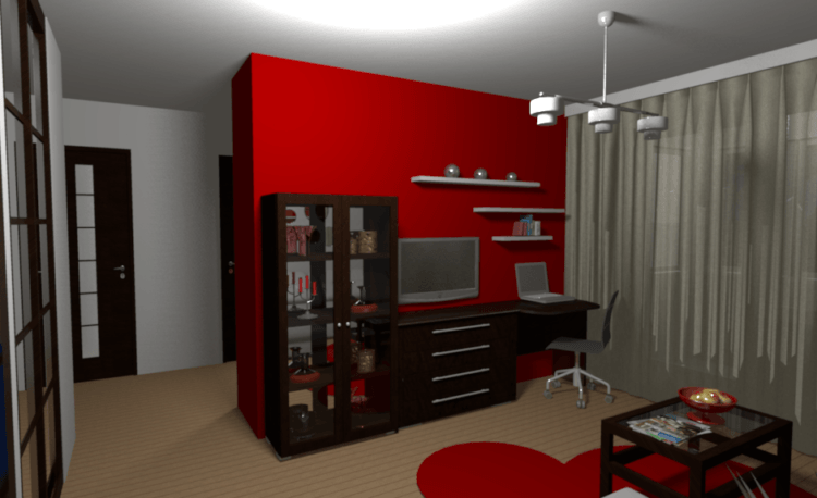 Las habitaciones en un apartamento de una habitación, decoradas en diferentes tonos de rojo, son una decisión audaz. Se ven geniales en combinación con tonos tranquilos.