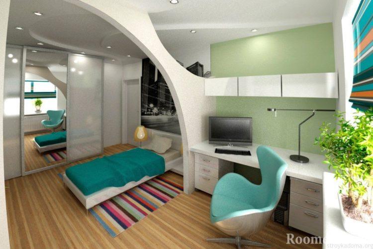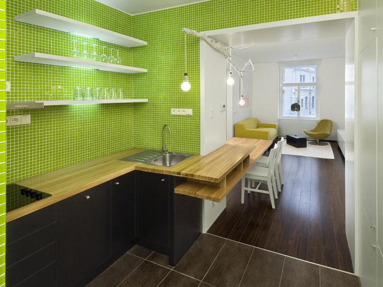 Diseño de apartamento de 1 habitación en interesantes tonos de verde, turquesa, menta, ideal para un interior moderno.