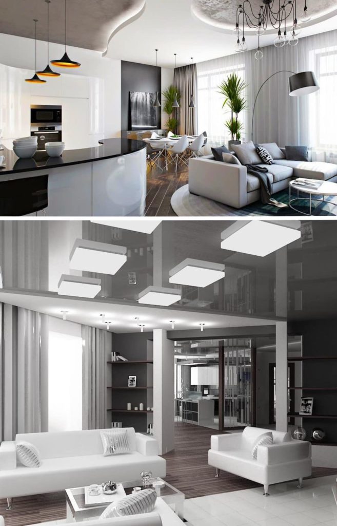 ¿Desea un hermoso techo en su apartamento, casa o habitación separada? En la foto verá varias opciones y tipos de acabados de techo para todos los gustos y precios. La decoración del techo es simple, y lo principal es elegir un buen color que armonice con el resto de la reparación en el hogar. Para que la decoración moderna sea más fácil de hacer techos tensados (son falsos).