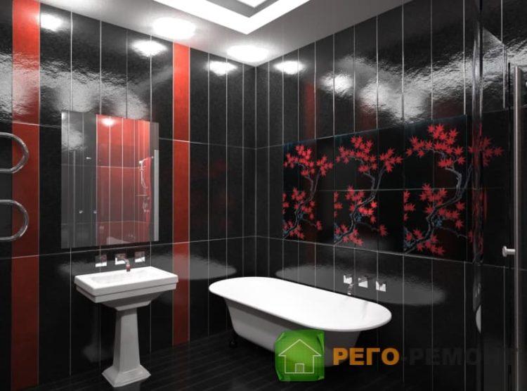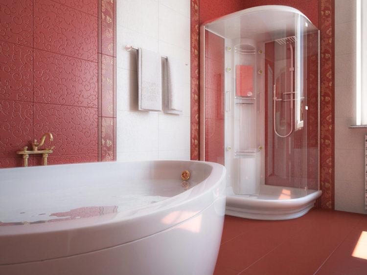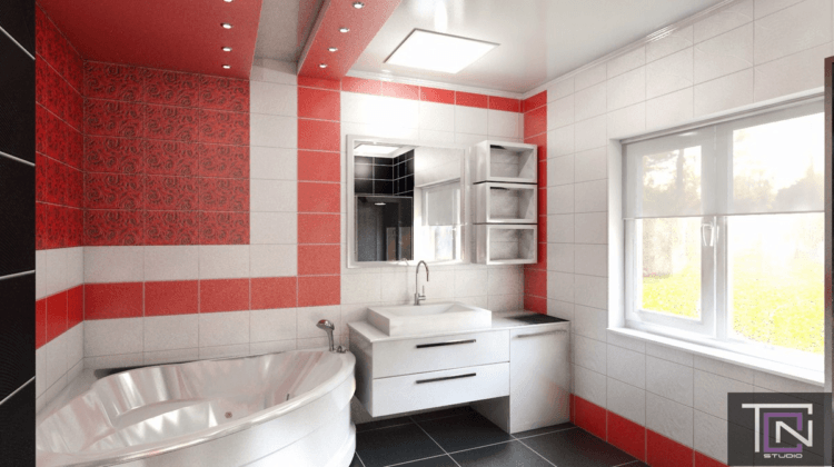 La idea de usar baldosas rojas se distingue por la sofisticación. El interior del baño, una foto de la cual en esta versión se presenta a continuación.