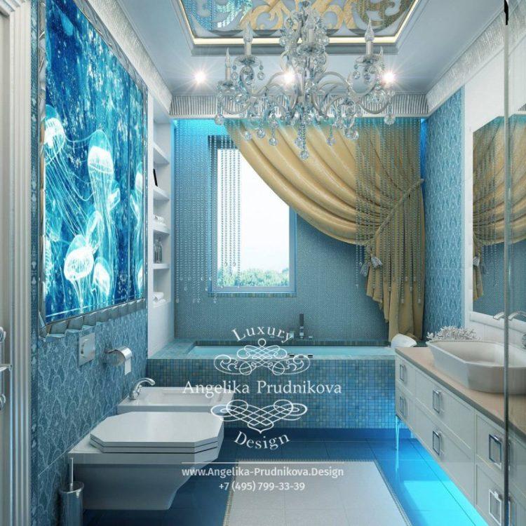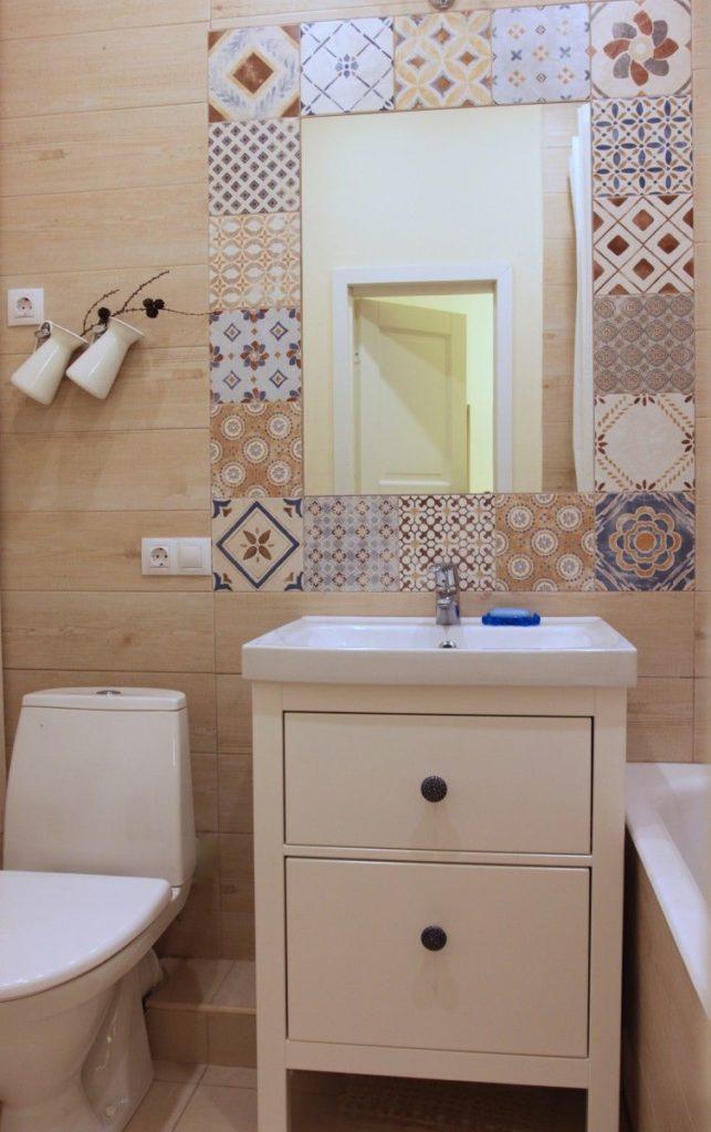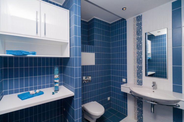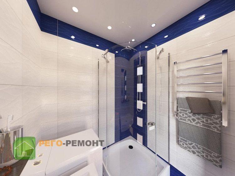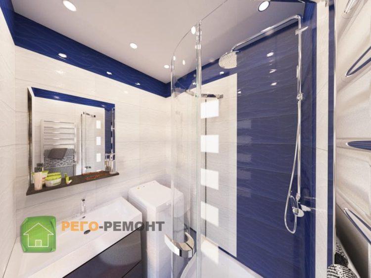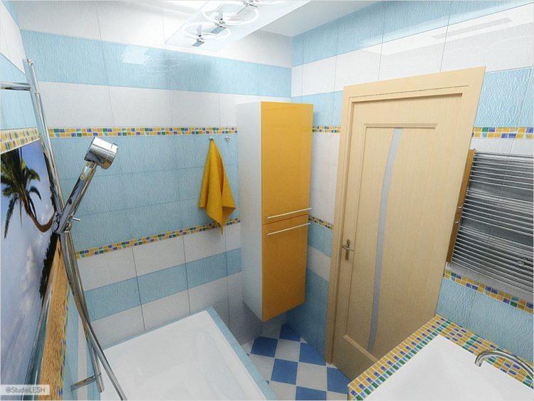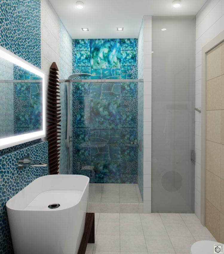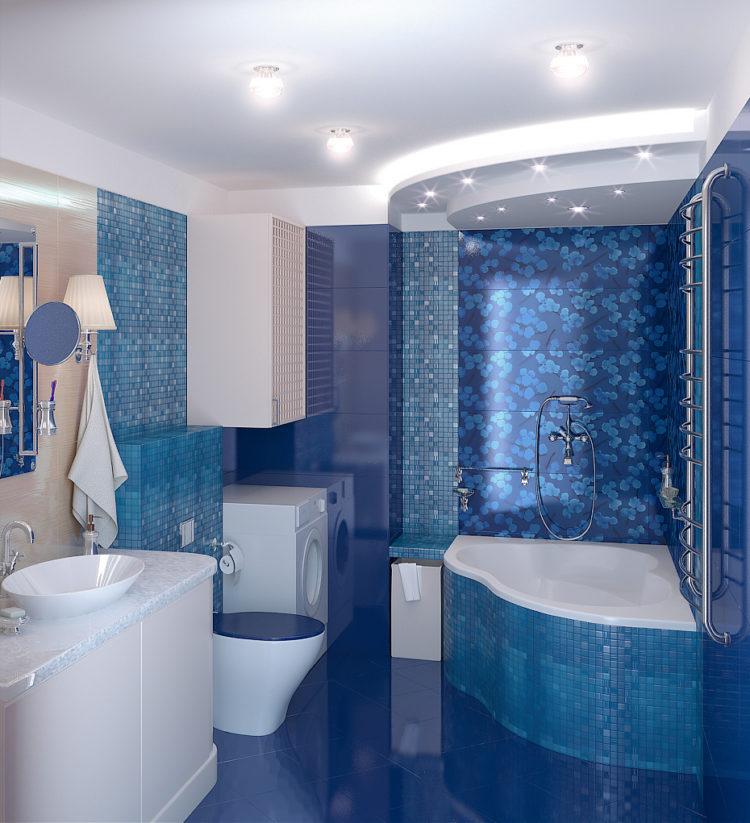 Los colores azules del baño son perfectos para personas activas y enérgicas. Renovación en un pequeño baño de una foto en la que se representan ideas similares.