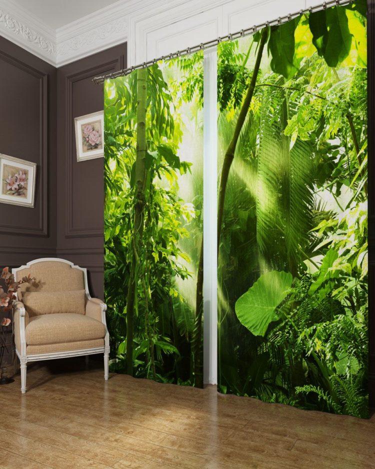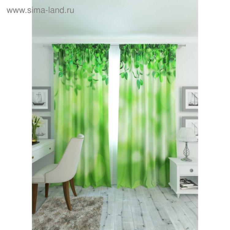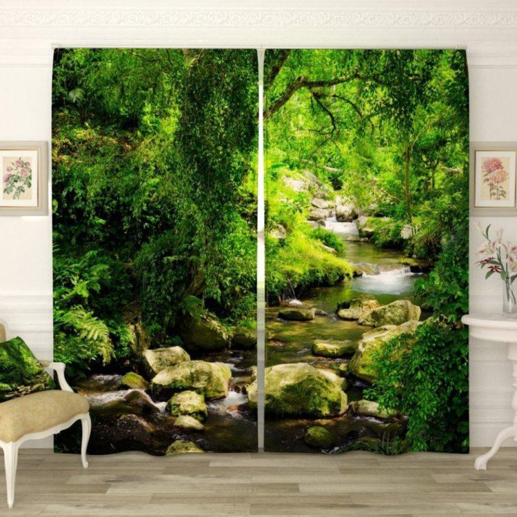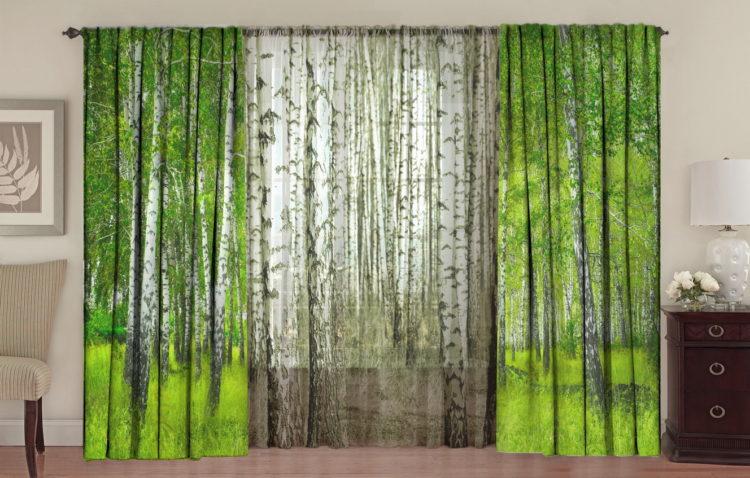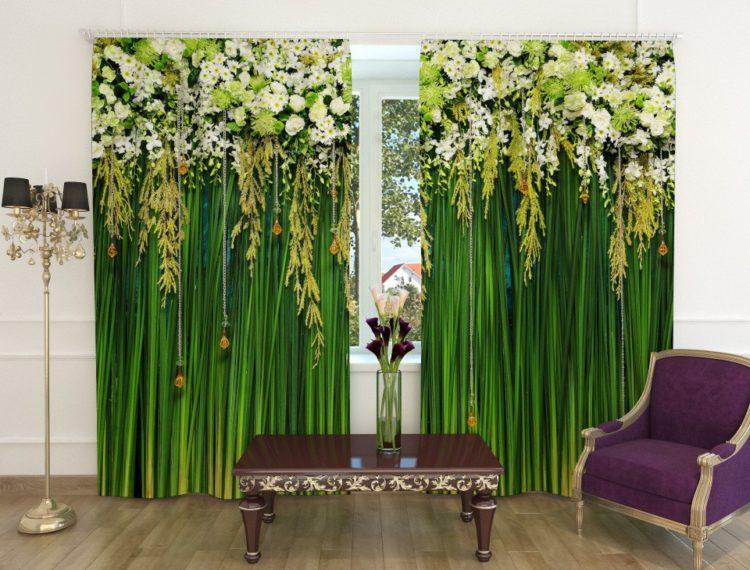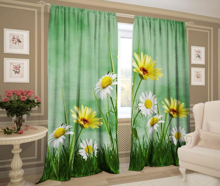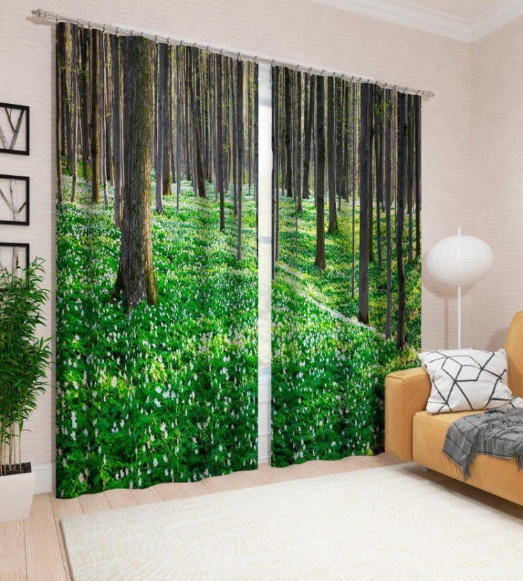Elija cortinas verdes, las imágenes de la naturaleza le darán a la habitación la vivacidad deseada.