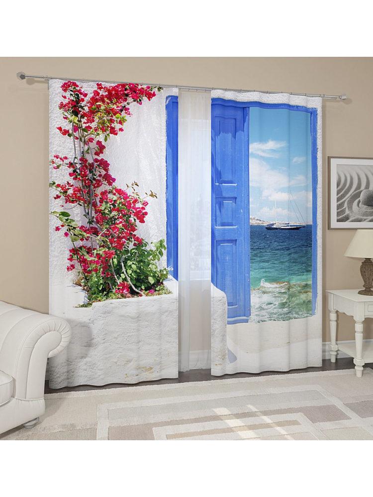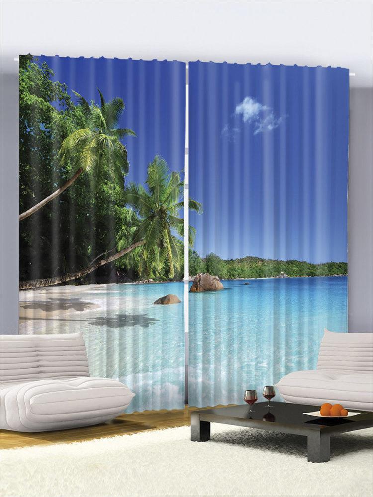Las fotos en las cortinas con un paisaje marino azul le recordarán sus vacaciones favoritas.