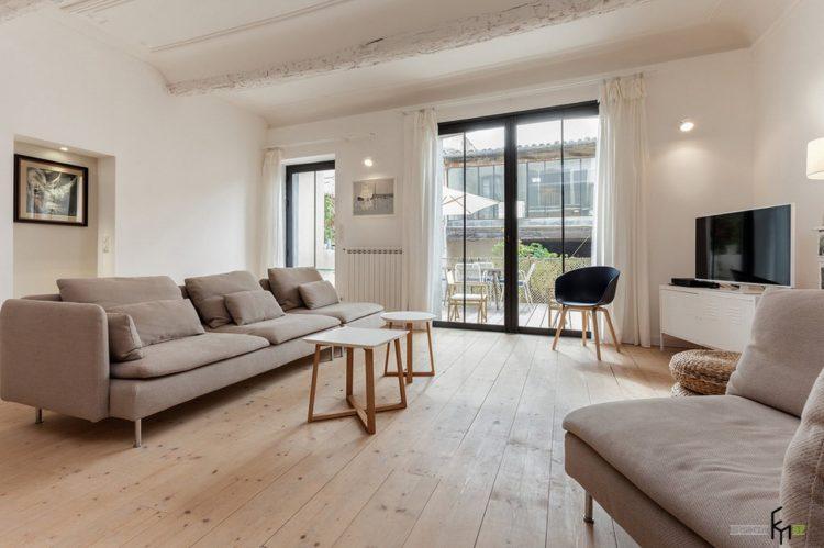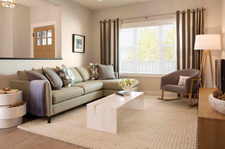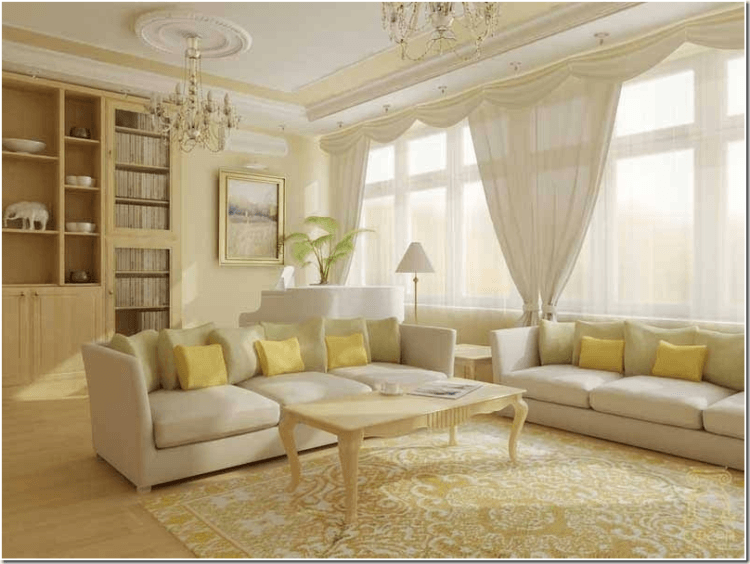 El interior de la sala de estar (ver foto a continuación), de color beige, se ve elegante y casi se considera un clásico. Especialmente armoniosamente caben un gran sofá de leche y cortinas blancas.